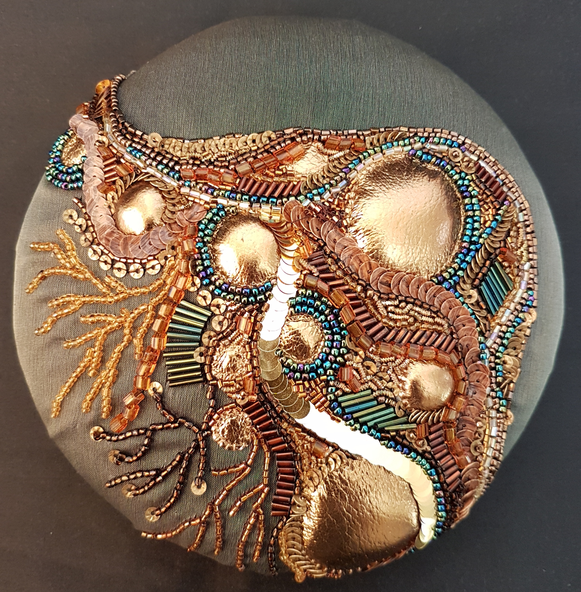 Haute Couture- en goudborduren op zijde. Afgewerkt om een fasinator van sinamay. De binnenkant is afgewerkt met een zijden bekleding.