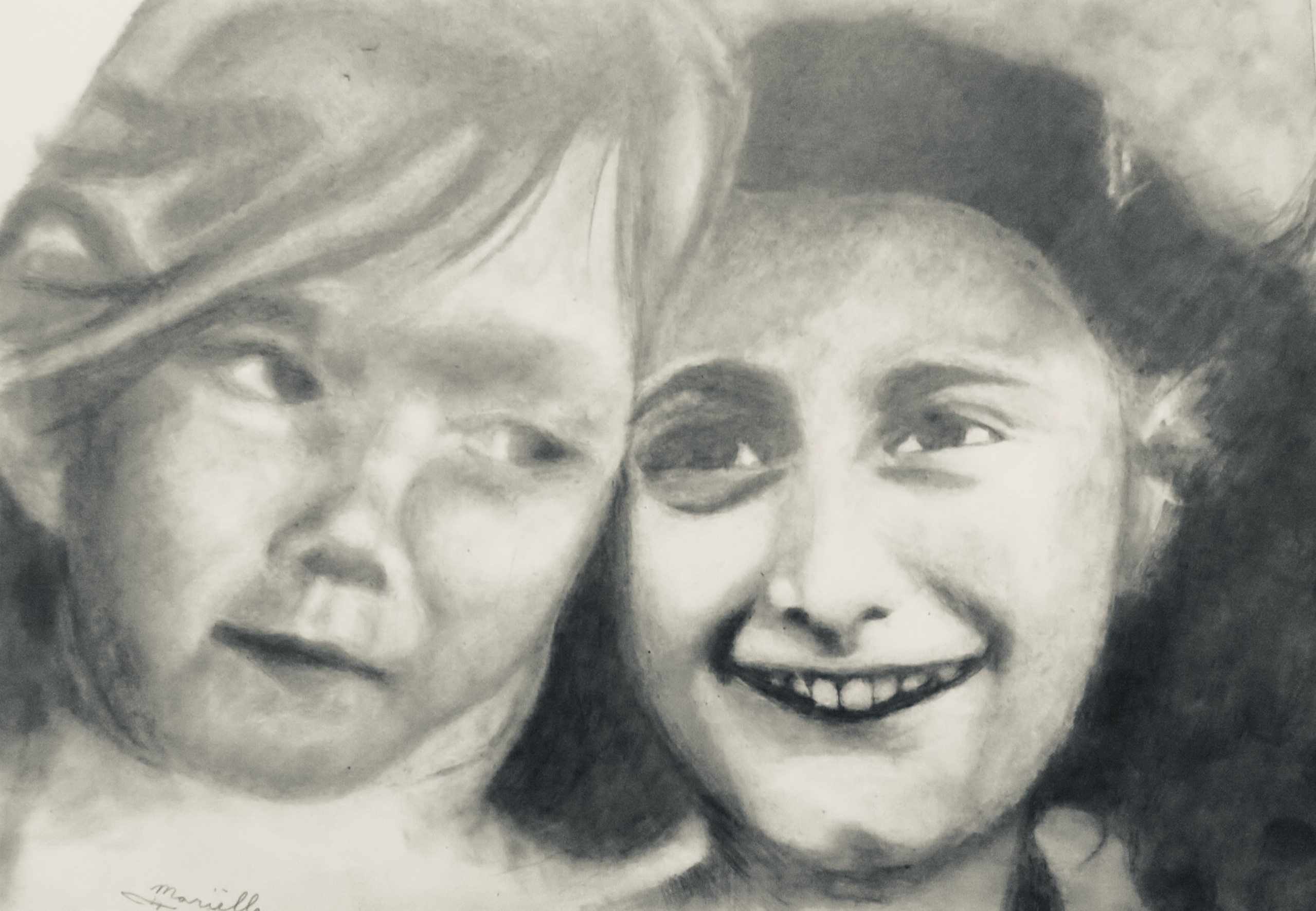 These two ladies have never met. Recently, a photo of Hannie Schaft in her childhood has also been found. She was important in the resistance against the Germans. Anne Frank was a symbol of the oppressed Jews in the Second World War It is wonderful to depict these power women in one drawing.