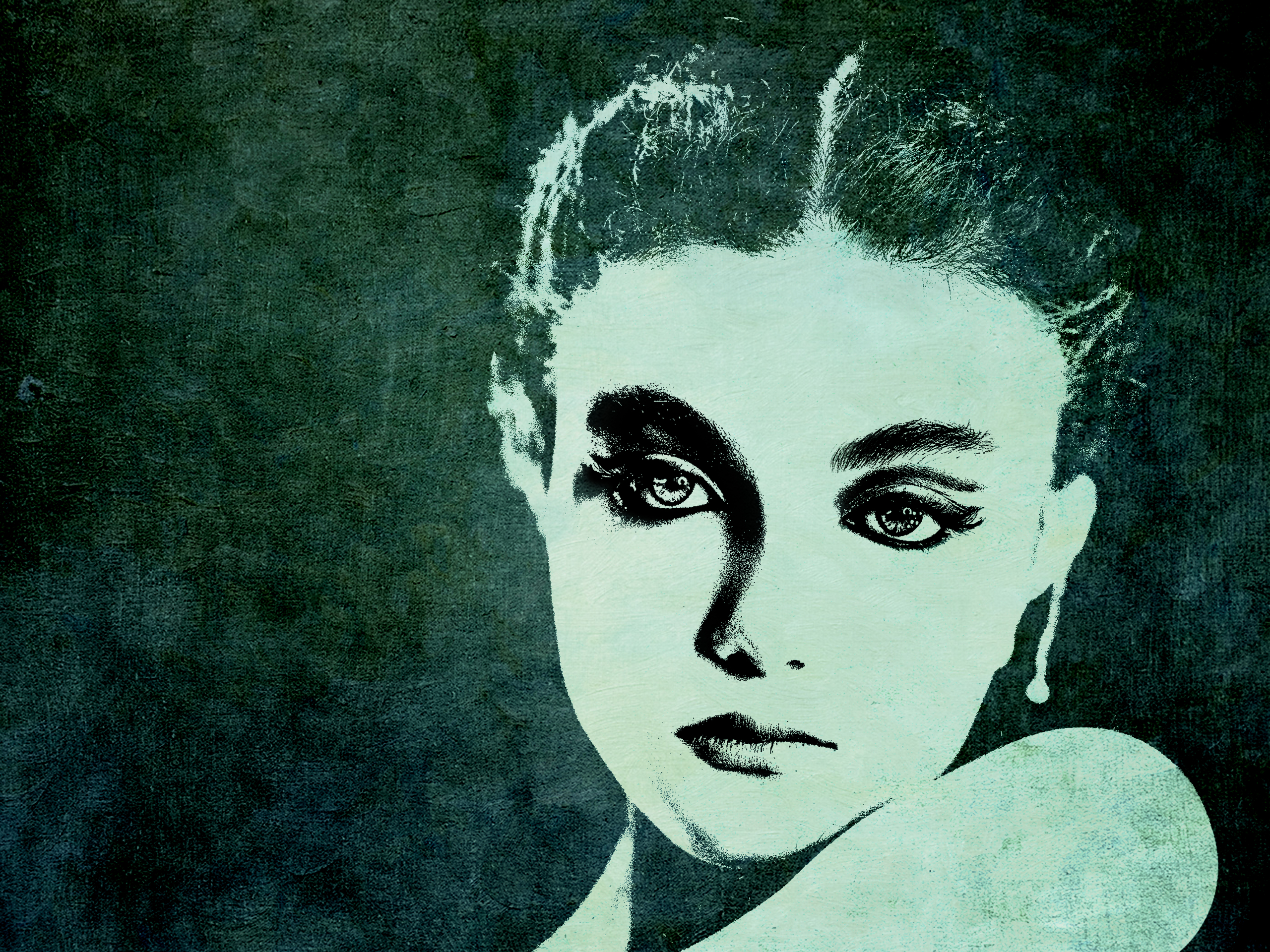 Portret van een vrouw met een melancholische blik. Alleen de sterke contrasten zijn zichtbaar op een schilderachtige, grunge achtergrond. De tinten zijn donker en doorleefd. De kleur neigt via groen, groenblauw, turquoise naar zwart. Je kunt speculeren wat er in het meisje omgaat, denkt ze aan een onmogelijke liefde, heeft ze net een persoonlijk verlies geleden, wat houdt haar bezig? Welke emoties spelen er in dit serene gelaat? Verkrijgbaar als print in diverse maten via https://www.werkaandemuur.nl/nl/shopwerk/Melancholie/714306/132?mediumId=1&size=80x60