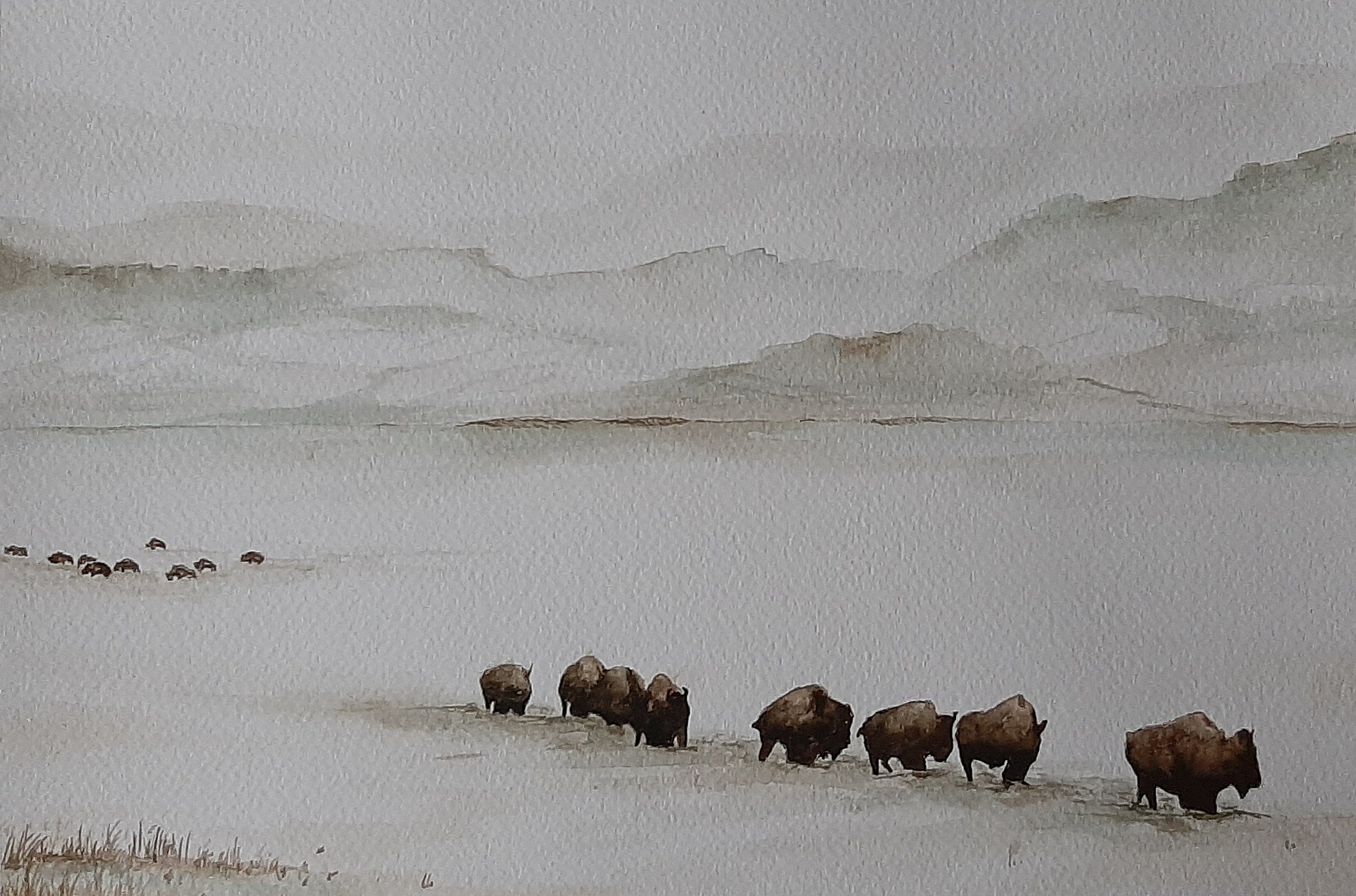 In december 2020 zag ik op tv een documentaire van National Geographic over bisons in het Yellowstone National Park in Montana / Wyoming. Bisons in de sneeuw in prachtige winterlandschappen. Ik ben onmiddellijk begonnen om ze ook zelf in beeld te brengen. Als aquarel. Prachtige, indrukwekkende beesten in de sneeuw. Tijdens onze reis door Yellowstone in 2017 zagen we die machtige beesten met eigen ogen in Lamar Valley in Yellowstone.N.P. (Montana/USA). Maar wel eind augustus, in de zomer dus. De vermelde prijs is exclusief passe-partout en lijst.