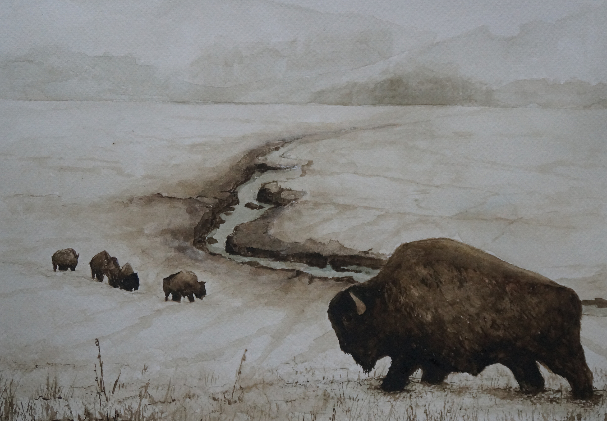In december 2020 zag ik op tv een documentaire van National Geographic over bisons in het Yellowstone National Park in Montana / Wyoming. Bisons in de sneeuw in prachtige winterlandschappen. Ik ben onmiddellijk begonnen om ze ook zelf in beeld te brengen. Als aquarel. Prachtige, indrukwekkende beesten in de sneeuw. Tijdens onze reis door Yellowstone in 2017 zagen we die machtige beesten met eigen ogen in Lamar Valley in Yellowstone.N.P. (Montana/USA). Maar wel eind augustus, in de zomer dus. De vermelde prijs is exclusief passe-partout en lijst.
