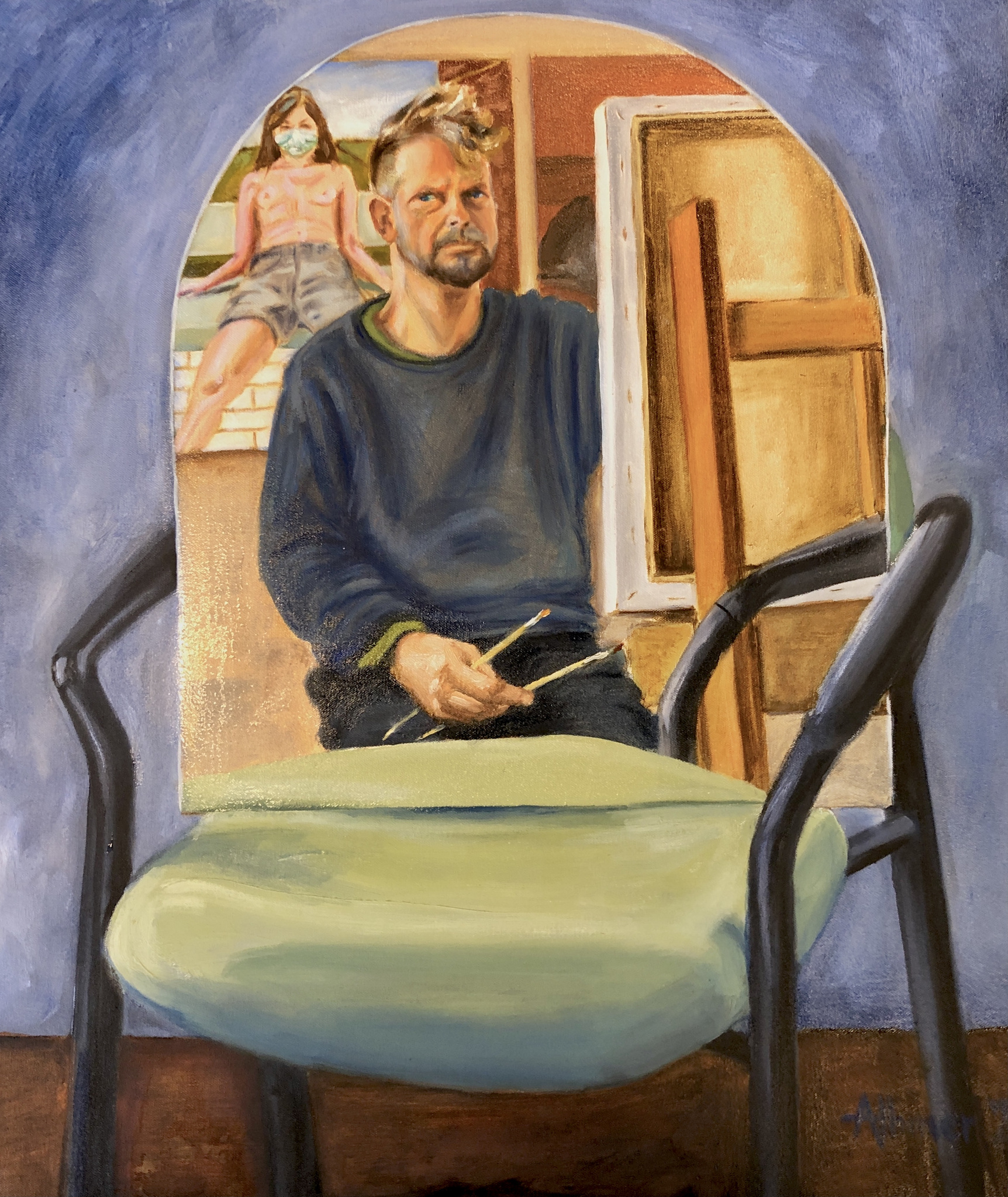 Zelfportret met portret van Lidewij op de achtergrond, december 2020.