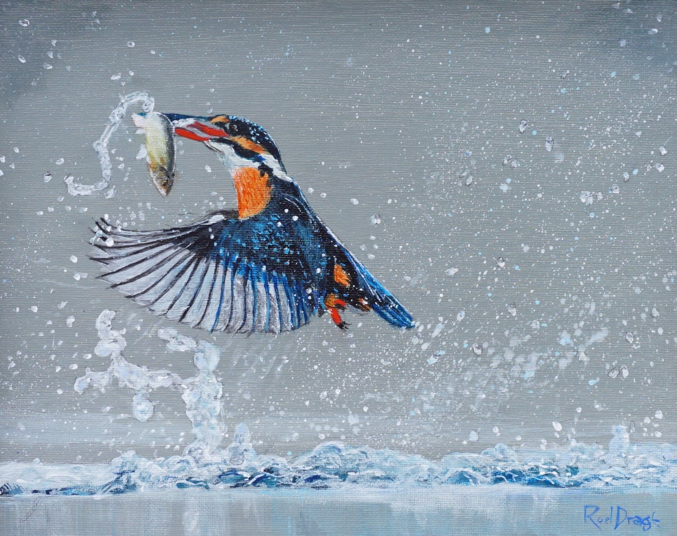 IJsvogel met vis. Acryl op paneel/doek. 24 x 30 cm