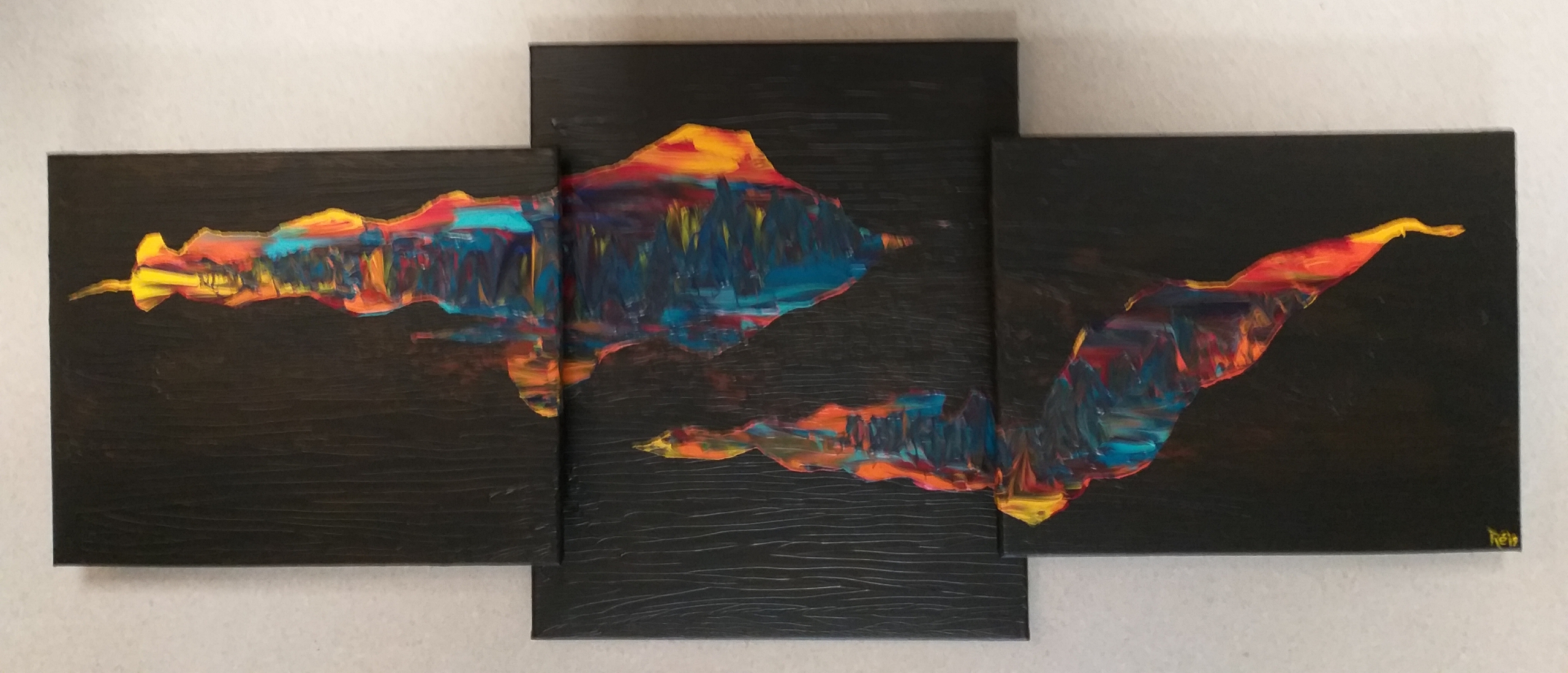 Verborgen landschap meer diepte zonnekracht strak noordelicht of ...., gemaakt uit 3 doeken 1 wat grote op de achtergrond met 2 kleinere doeken zwevend ervoor, ondergronden grof de verf erop uitgerold de vormen eerst al plakkend vorm trachten te geven met verloop van ene naar andere doek. Zo wordt voor mij in ene geheel weer anders! En ja mijn rest verf geeft steeds andere vormen nu misschien 2 eilanden.....