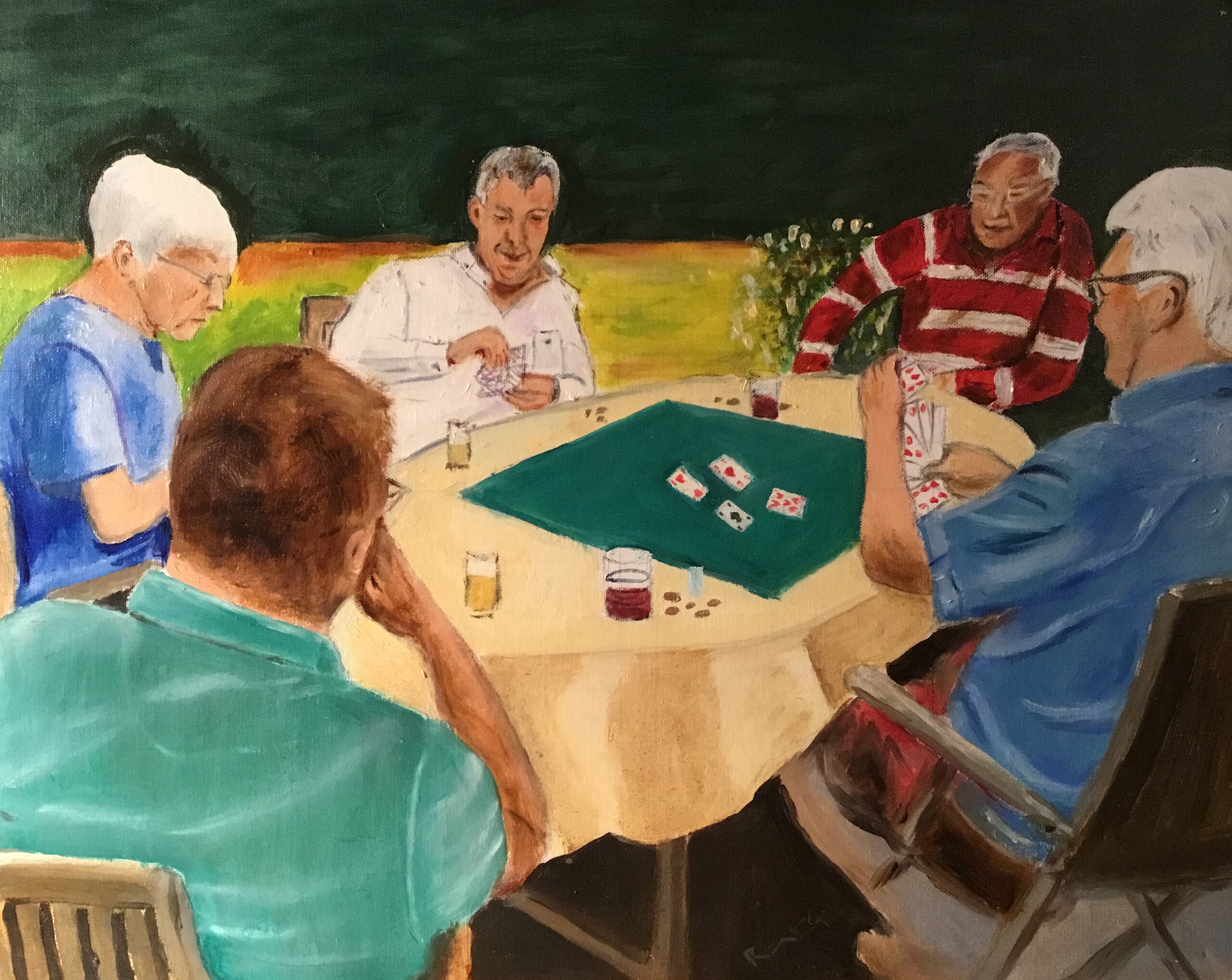 Vriendengroep zit in de tuin te kaarten. Het werkje is op een paneel geschilderd naar eigen foto.