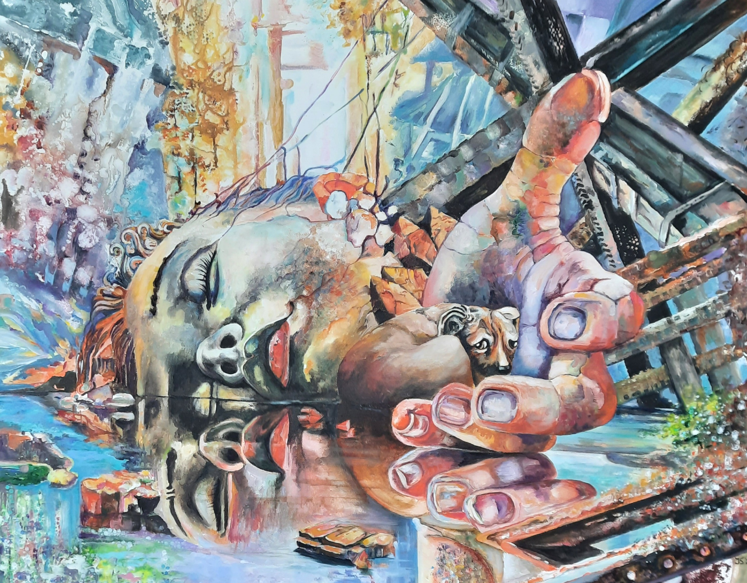 Acrylverf op doek ,naar een deepdream van Sylverdali, gemaakt met de deepdream generator online... naar een afbeelding van Maja Borowicz, leek mij wel een uitdaging om een computerbeeld naar verf te vertalen..maar met verschillende technieken ,ben niet ontevreden over het eindresultaat.. Op dit moment is dit schilderij alleen als kunstkaart te bestellen...... Op werkaandemuur.nl is een mooie afdruk ,in vele formaten te bestellen...