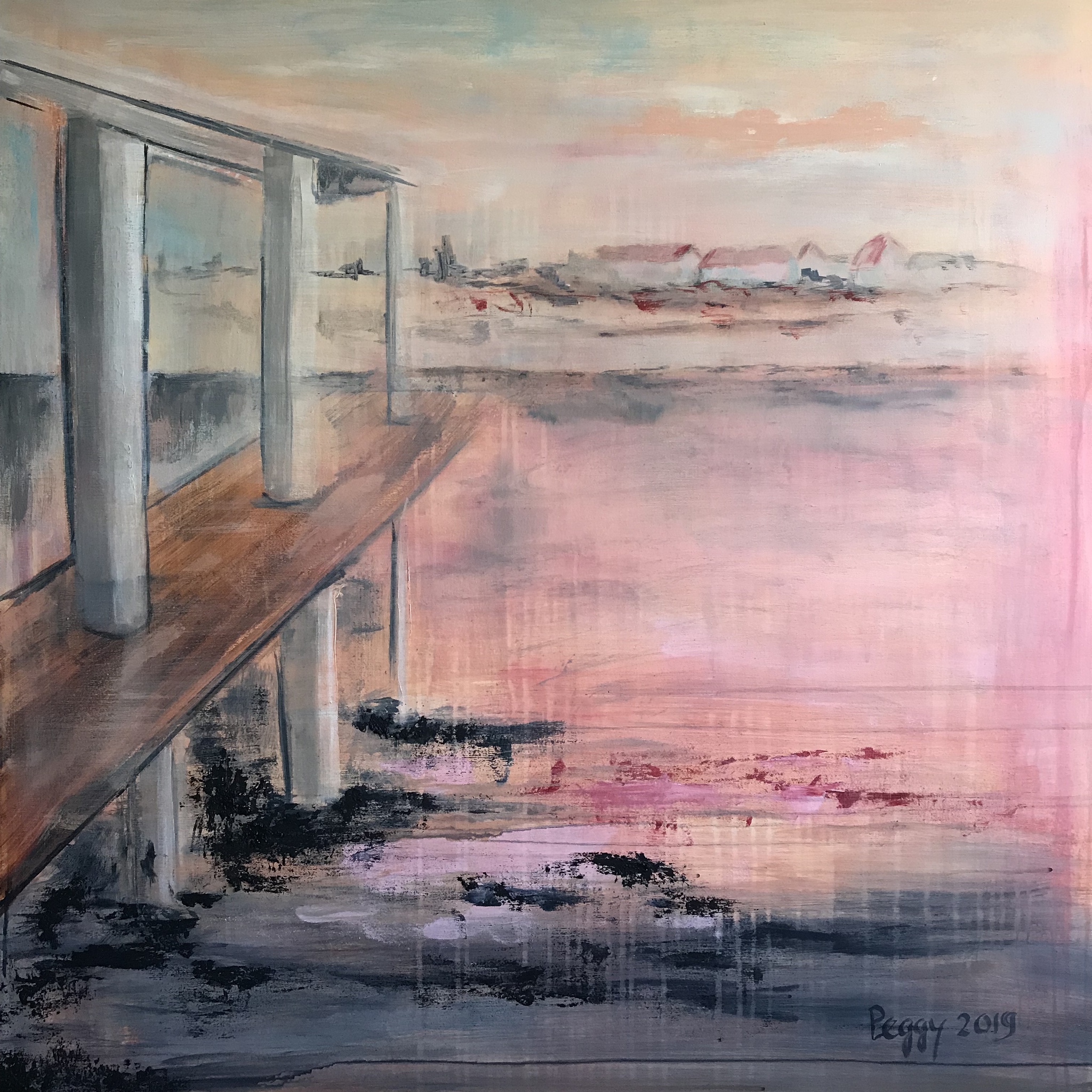 Ik werd geïnspireerd door vrijheid. Mijn vader vocht voor vrijheid in W.W. 2, ik draag dit aan hem op. Wat je ziet zijn pilaren in het water met op de achtergrond een klein dorpje op een mooie wintermiddag. De peilers stoer als een rots in de branding. Maat: H 100 cm x B 100 cm x D 4 cm. Klaar om op te hangen. Gesigneerd voor het schilderij. Gewicht: 3,3 kg. Schilderij: acryl.