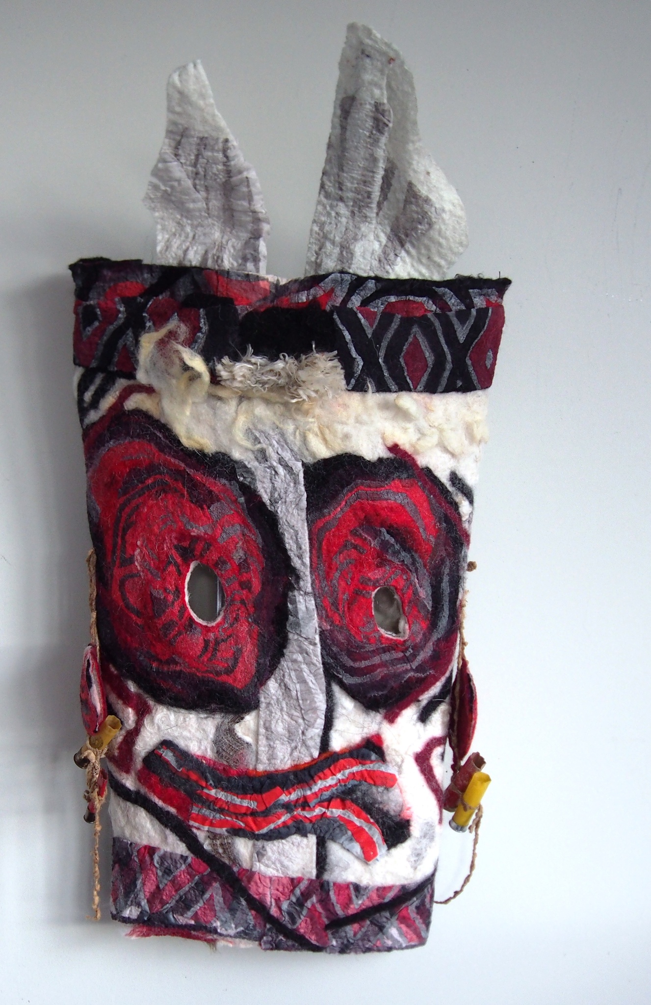 Masker gebaseerd op Inuit cultuur, Maakt onderdeel uit van de serie Alaska, alles in het kwadraat. Wol en zijde samen vervilt op een stalen frame