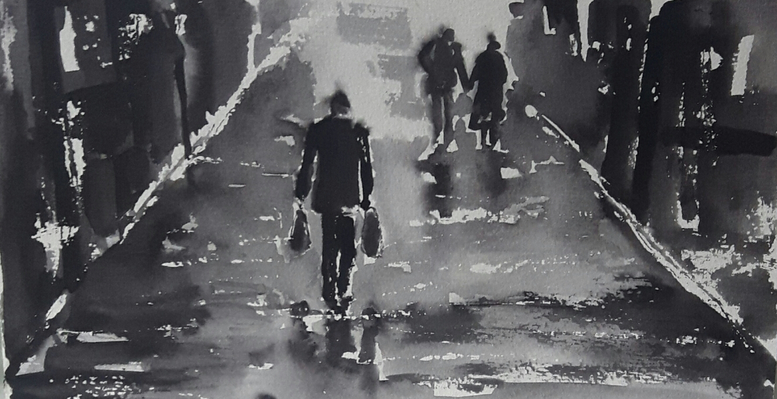 Een nat en donker straatje. De laatste boodschappen gedaan en nu gauw naar huis.