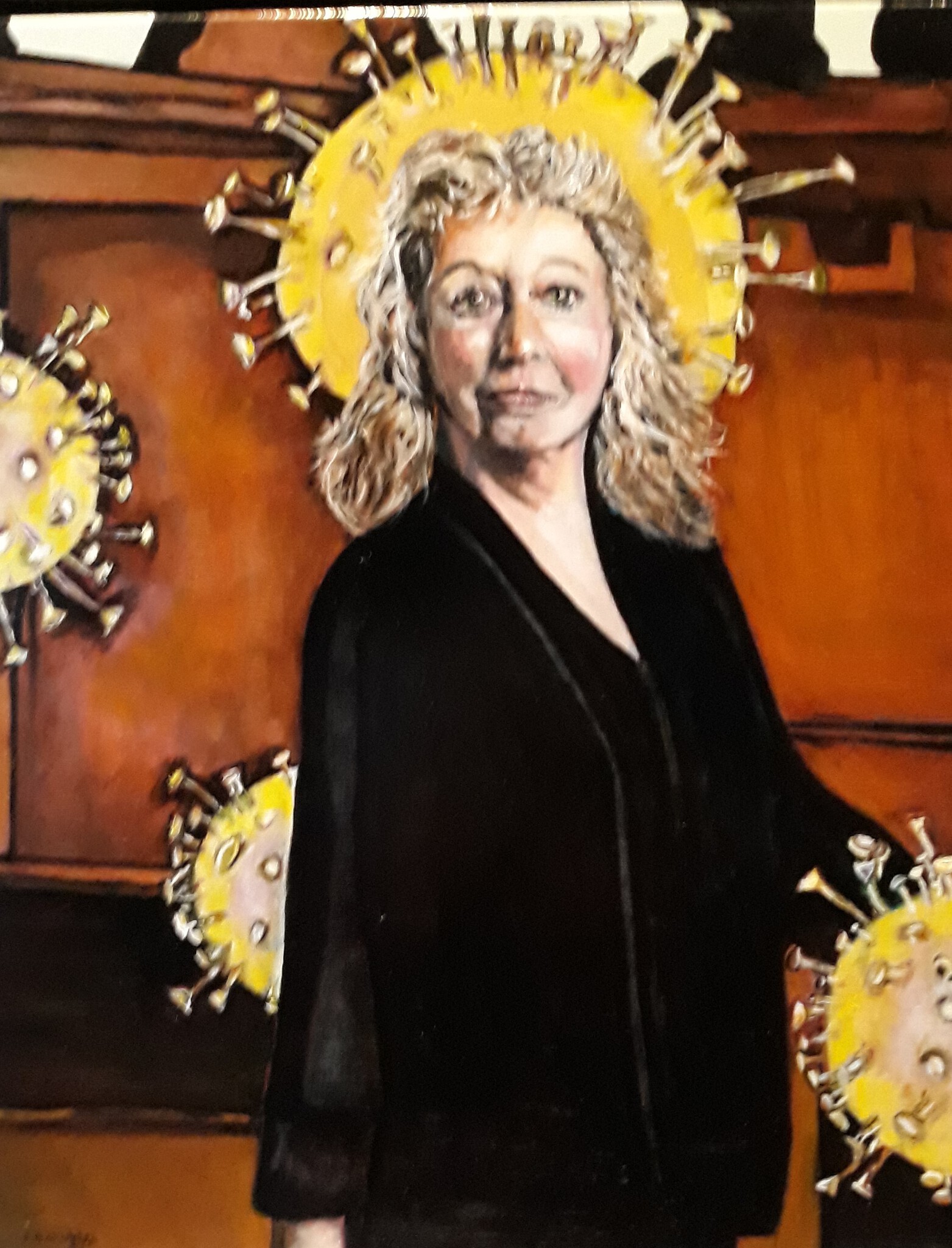 La Corona is niet alleen een heel besmettelijke Covid-19 virus maar komt ook in de Maya - cultuur voor in Guatemala dit is een land in Centraal Amerika. Het olieverf schilderij is een zelfportret met geschilderde covid- virussen en de achtergrond is een kerkinterieur. Inspiratie bronnen zijn iconen en middeleeuwse schilderkunst.
