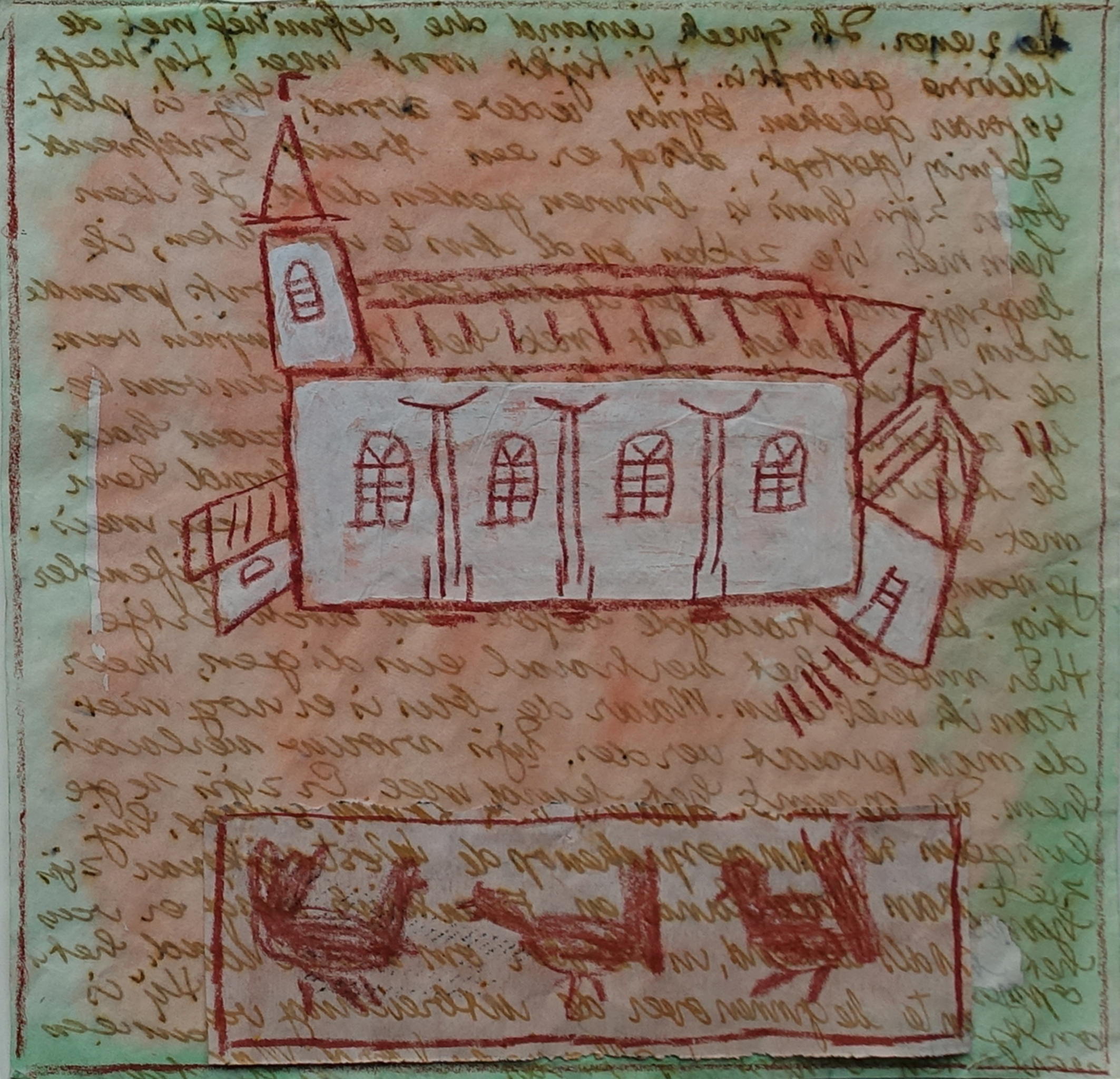 Tegenover het kerkje wonen kippen. Ze mogen niet ontbreken. Vooral de witte kippen komen er tot hun recht! Tekenen als een kind voelt als thuiskomen.