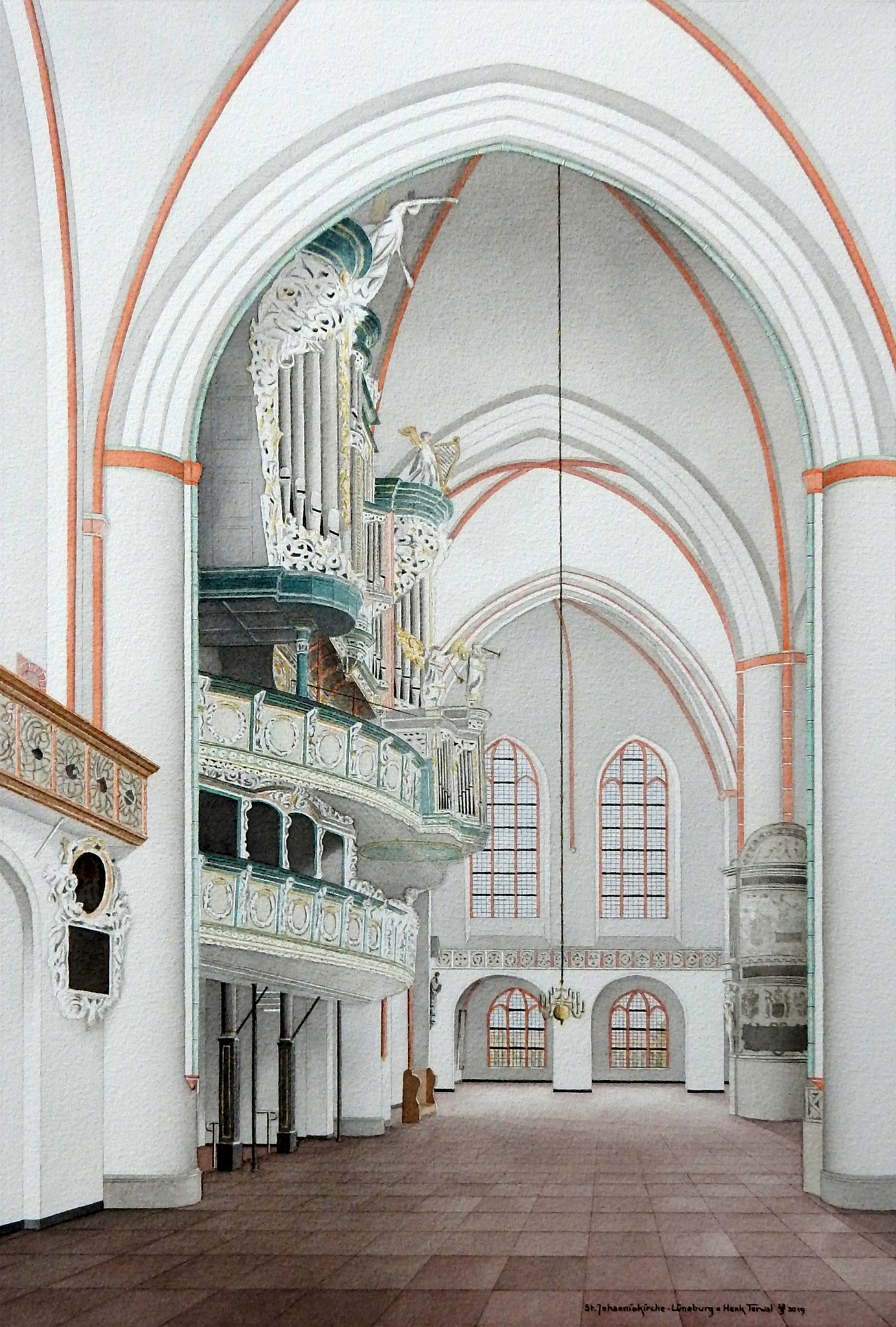 De kerk is een 5-beukige hallenkerk in Lüneburg en gebouwd - in de backsteingotiek - tussen 1289 en 1470. Het is de oudste kerk van deze Hanzestad. De toren meet plm.110 meter hoog. Naast diverse kunstschatten bezit het een beroemd orgel welke dateert van 1553 en vervaardigd door Hendrik Niehoff. Later is het nog twee keer uitgebreid. Twee markante epitafen van de familie Stöterogge (burgermeesters en Sülfmeisters) sieren de kerk. Van Nikolaus(*1497) is de epitaaf op de aquarel zichtbaar. Prominent is het orgel met fraaie kas aanwezig in de aquarel. Een centraal perspectief van de westelijke travee van zuid naar noord