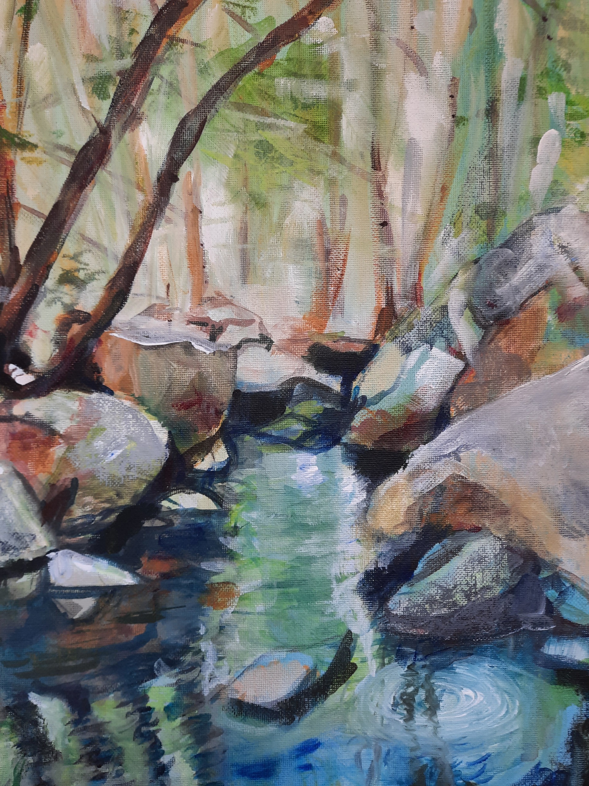 Acryl op doek. Een klein riviertje in het groen