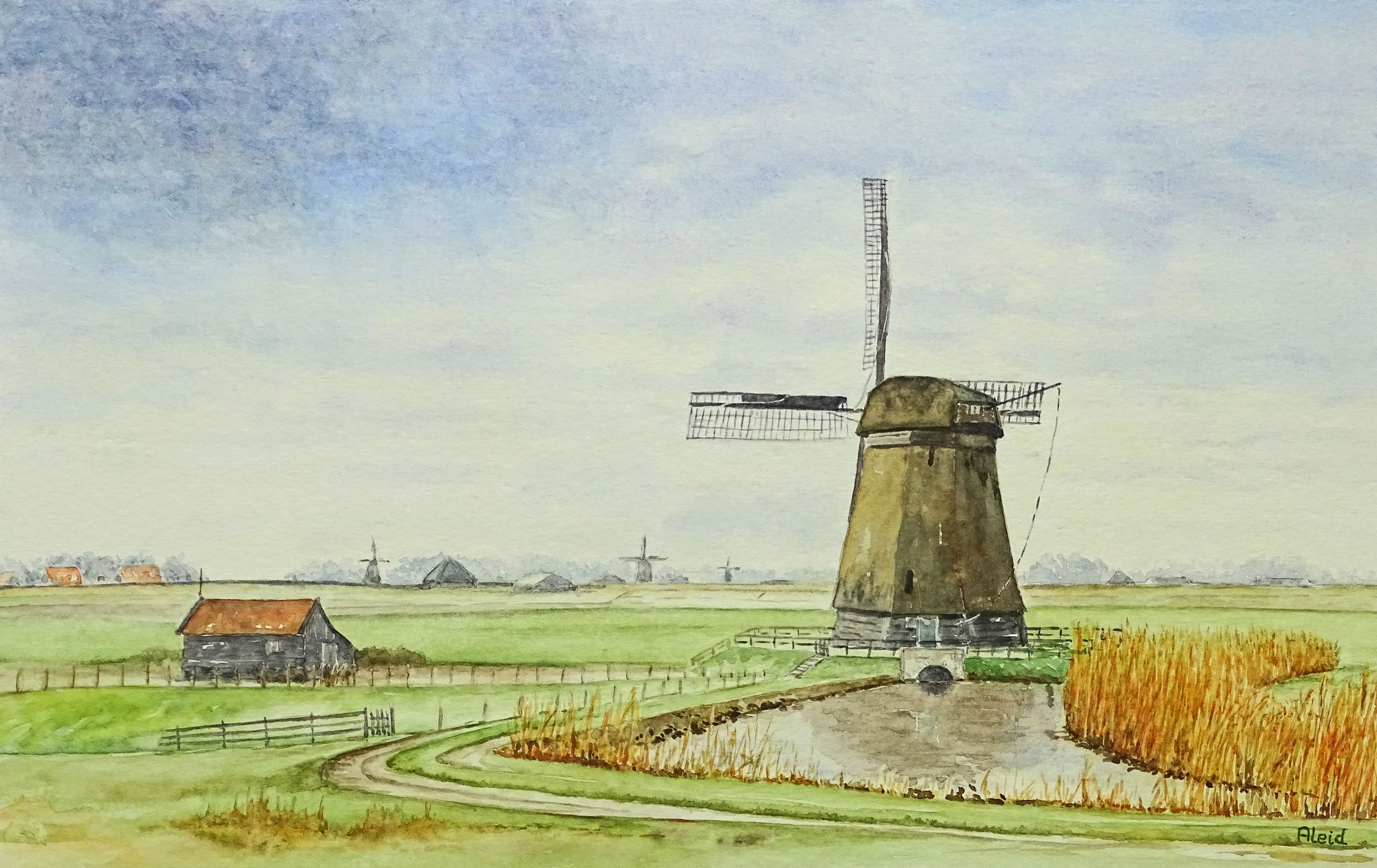 Mijn naam is Aleid Hagen (1954). Ik woon in Oterleek en schilder veel plekjes uit de Schermer en omgeving. Ik probeer de sfeer en wolkenluchten van het landschap te vangen in mijn aquarellen. Tijdens de vele fietstochten word ik nog steeds getroffen door ons mooie polderlandschap met de molens en de schilderachtige dorpjes. Maar ook de vogels, de koeien en andere dieren treffen me. Ik ben autodidact en heb het schilderen in aquarel mijzelf aangeleerd door veel te schilderen. Daarnaast heb ik boeken bestudeerd over onderwerpen zoals perspectief, compositie, kleurgebruik en de verschillende aquareltechnieken. Ook heb ik workshops van bekende Engelse aquarel schilders gevolgd. Ik wil mijzelf blijven verbeteren en zoek naar nieuwe onderwerpen.