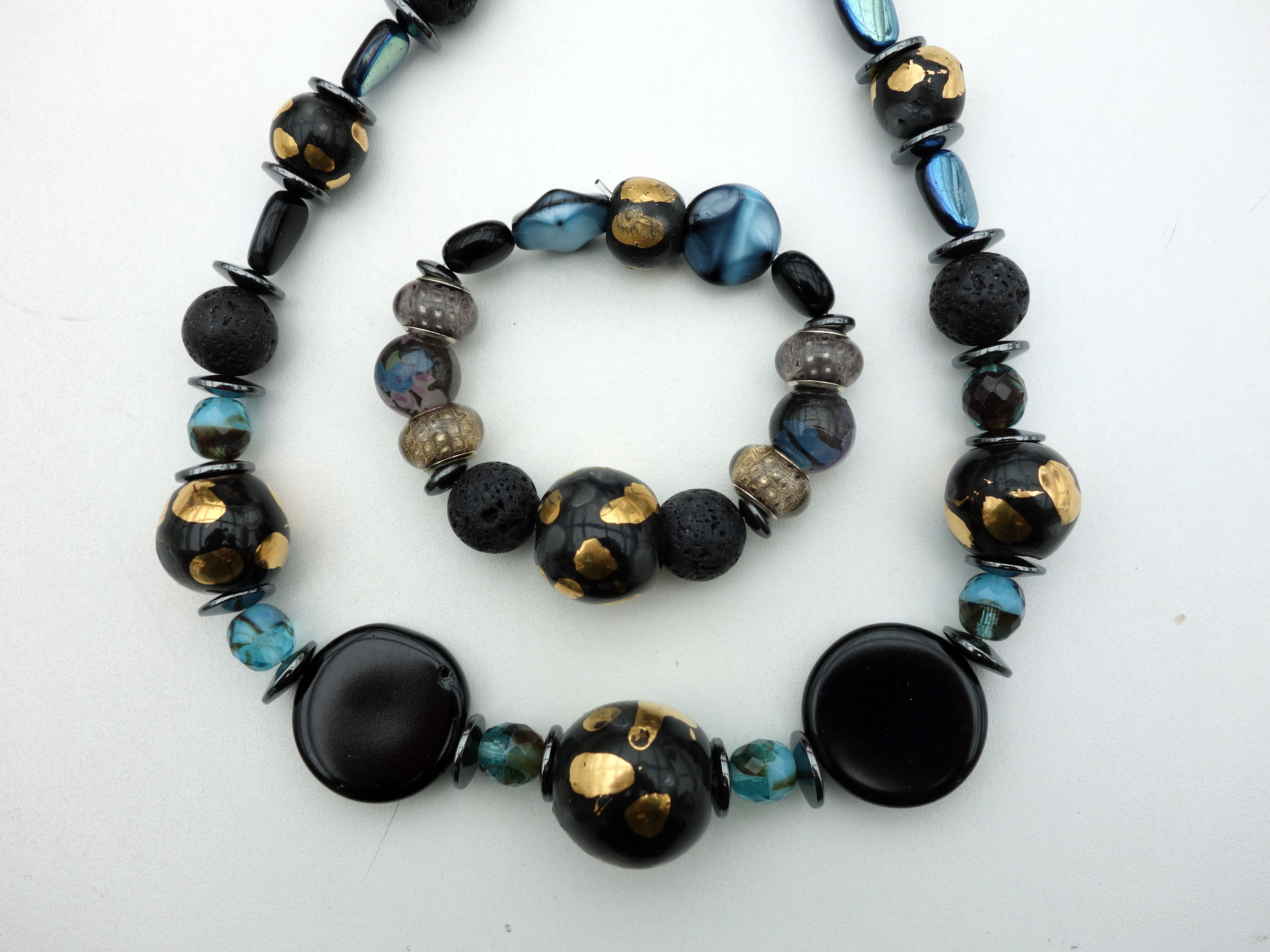 Dit zijn voorbeelden van mijn nieuwe reeks ongeveer 60 cm lange “blije” colliers met kralen van keramiek, glas, lava en halfedelsteen, blij, omdat ik er zelf blij van word. Deze unieke colliers zijn er in twee lengtes, ook van ong. 45 cm lang. Het collier is o.a. samengesteld met keramische kralen met een beetje echt goud, grote glazen kralen en lavakralen. Op de lavakralen kun een beetje van je lievelingsparfum doen. De armband kost € 24.- en is apart te koop