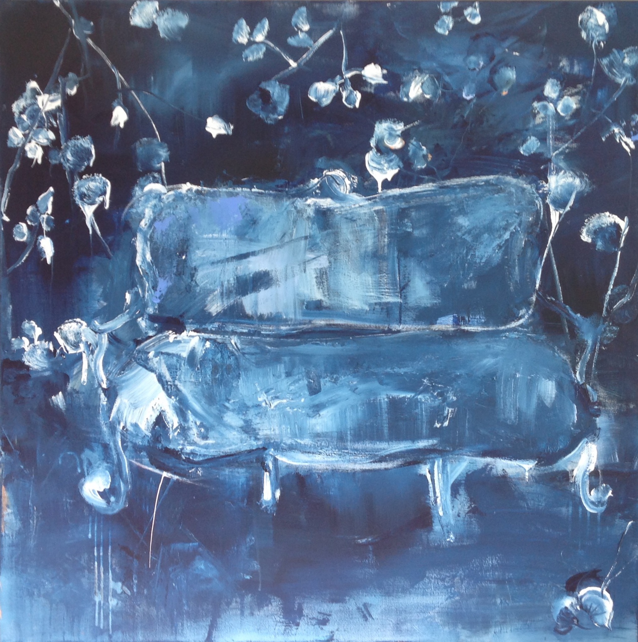 I see an abstract painting of a blue sofa full of flowers. Flowers are for me a symbol to.... flowers to give, flowers to get, romance, happy, flower love, flowerpower the chair or sofa is a symbol for support de prijs is exclusief verzenden