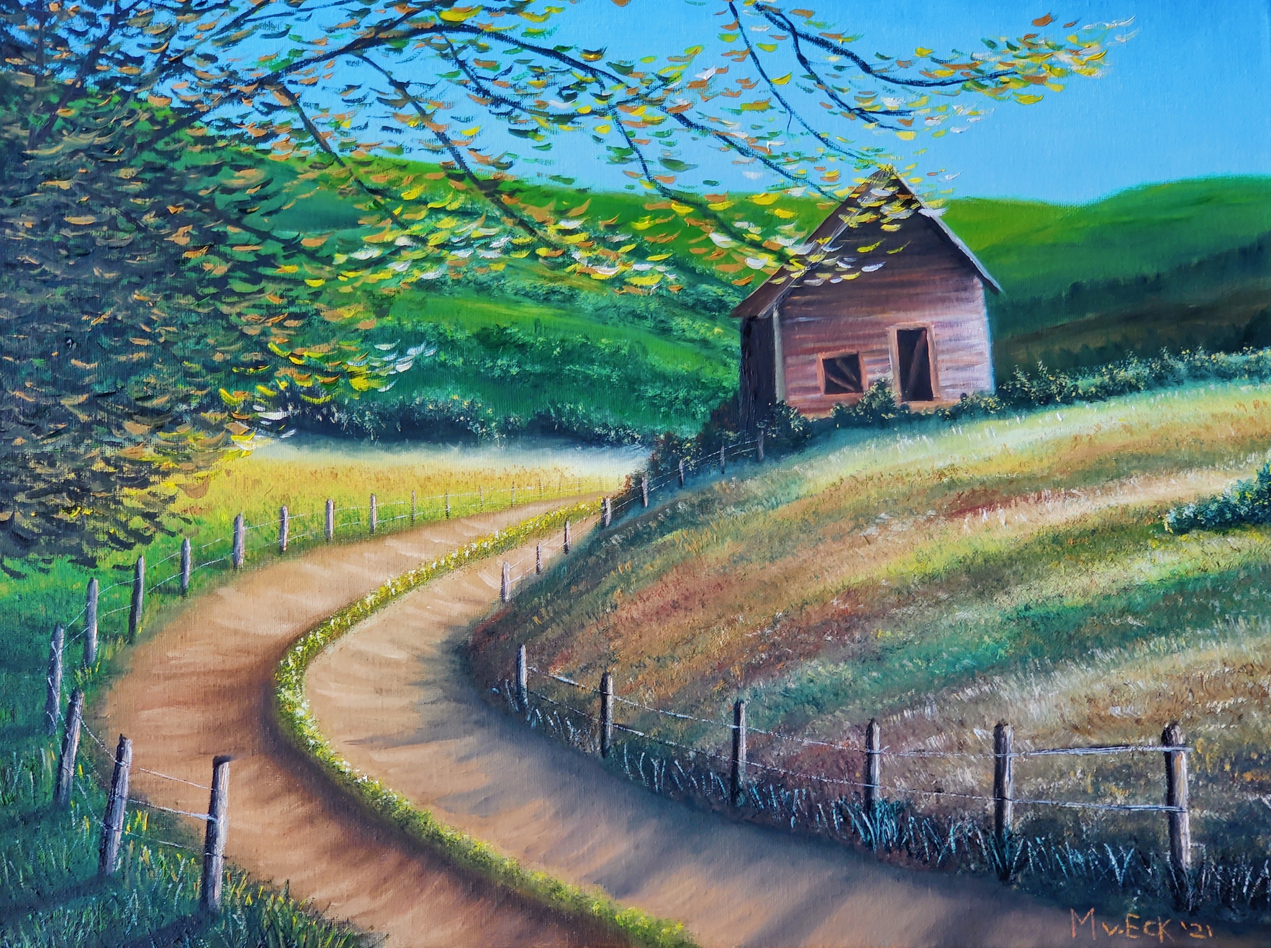 Cabin on the Hill, olieverf op doek, Merel van Eck 2021. Dit schilderij is gebaseerd op een tutorial van Kevin Hill.