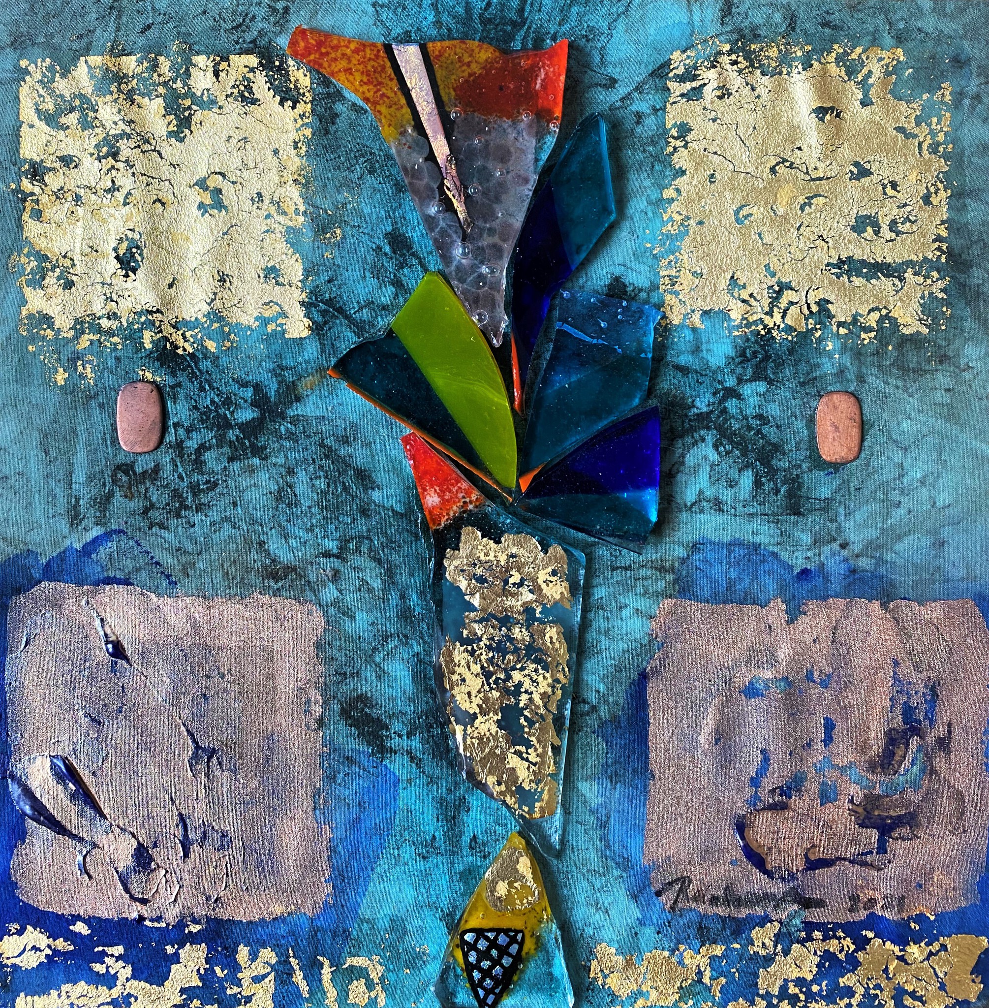 Gold Terra Goud Groen Glas Object Tuin Kunst Verhalend Textiel Collage Birds Keys Bladgoud Transparant Lotus Temple Abstrakt Hortus 24 Feathers Leaf Oriental Gingko Koperverf