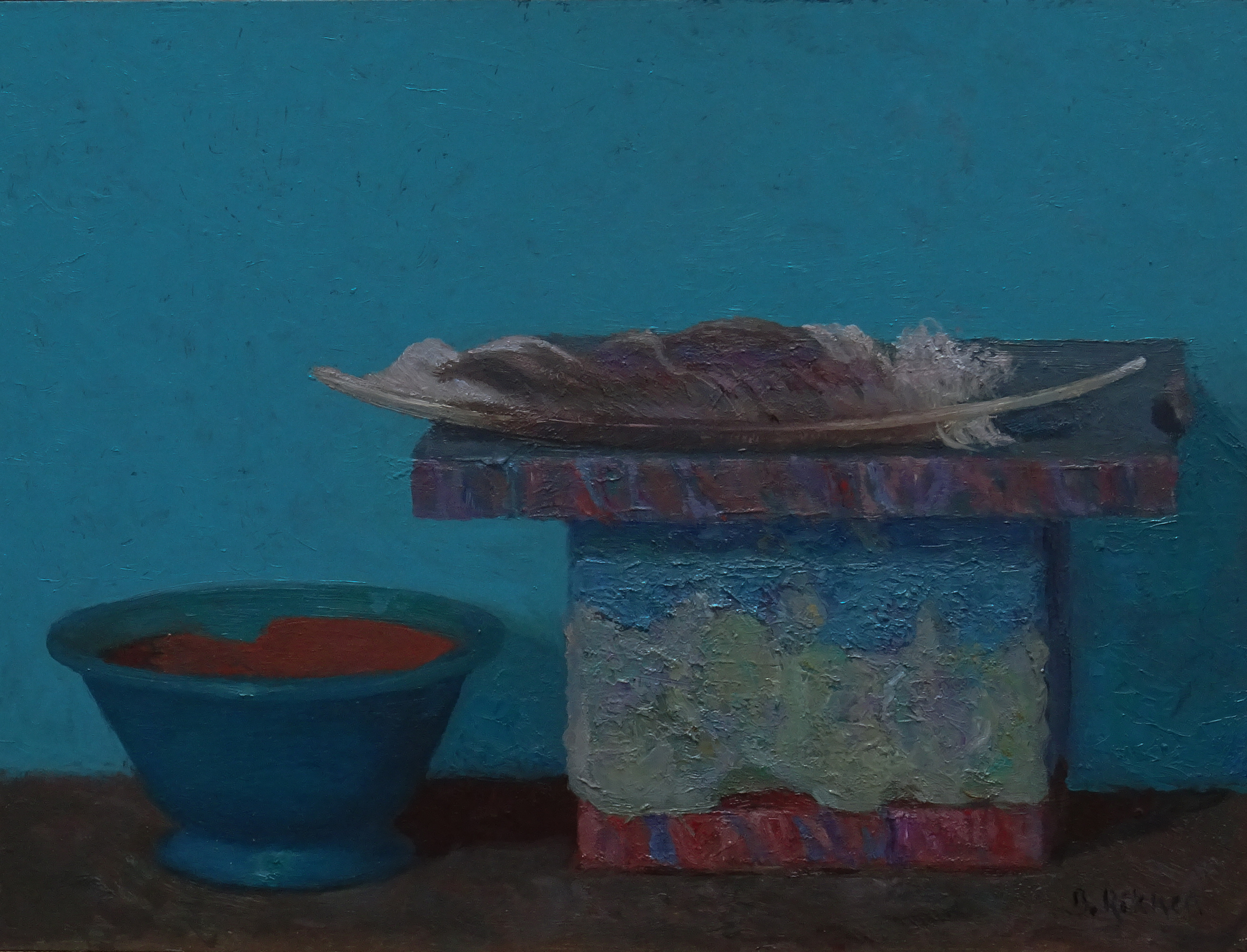 Licht en zwaar, licht en donker, blauw -groen en rood, drie tegenstellingen in een stilleven.