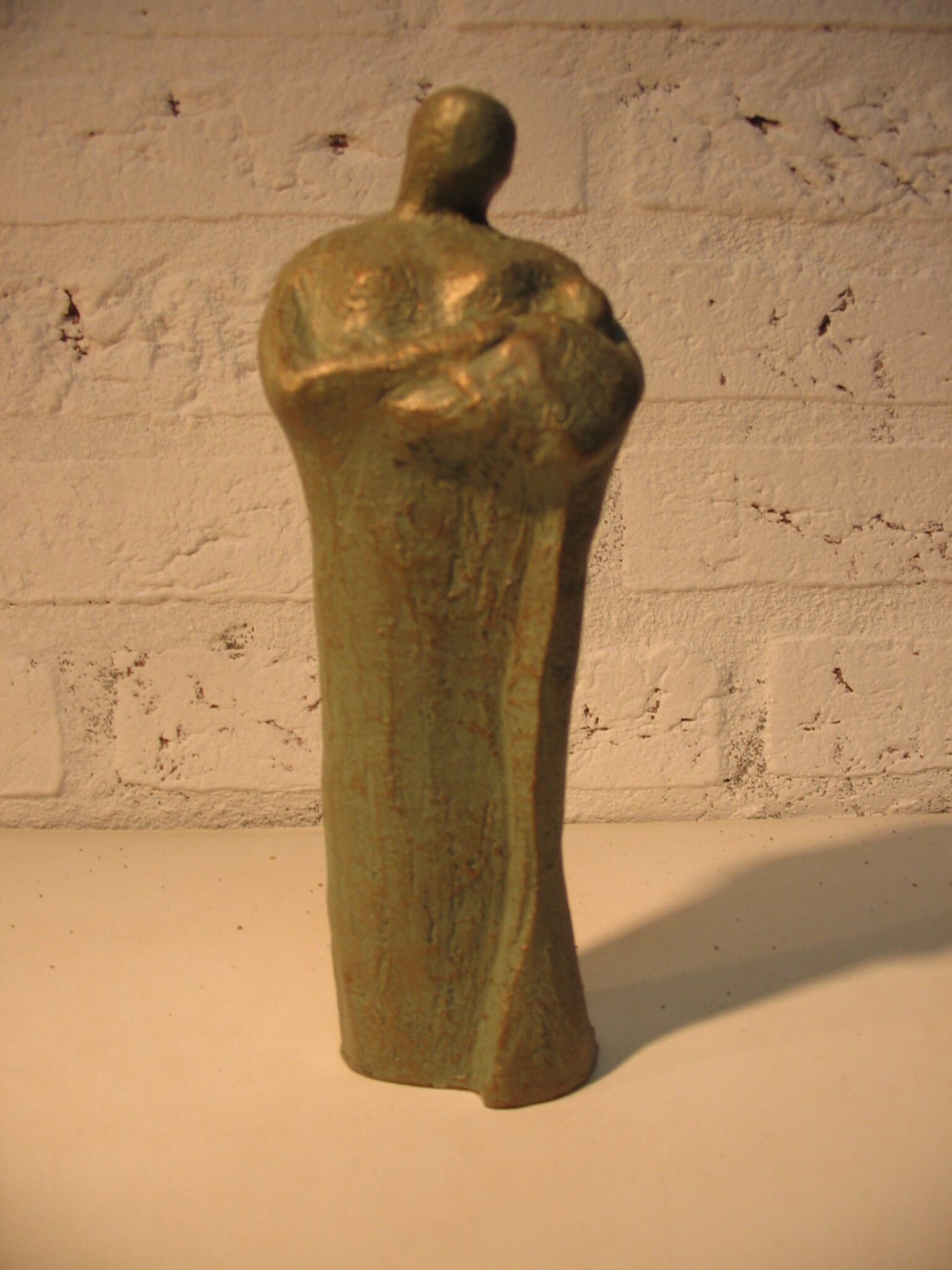 Familiebeeldje van een moeder met haar baby. Uitgevoerd in gegoten Neolith met groene acryl en bronscoating.