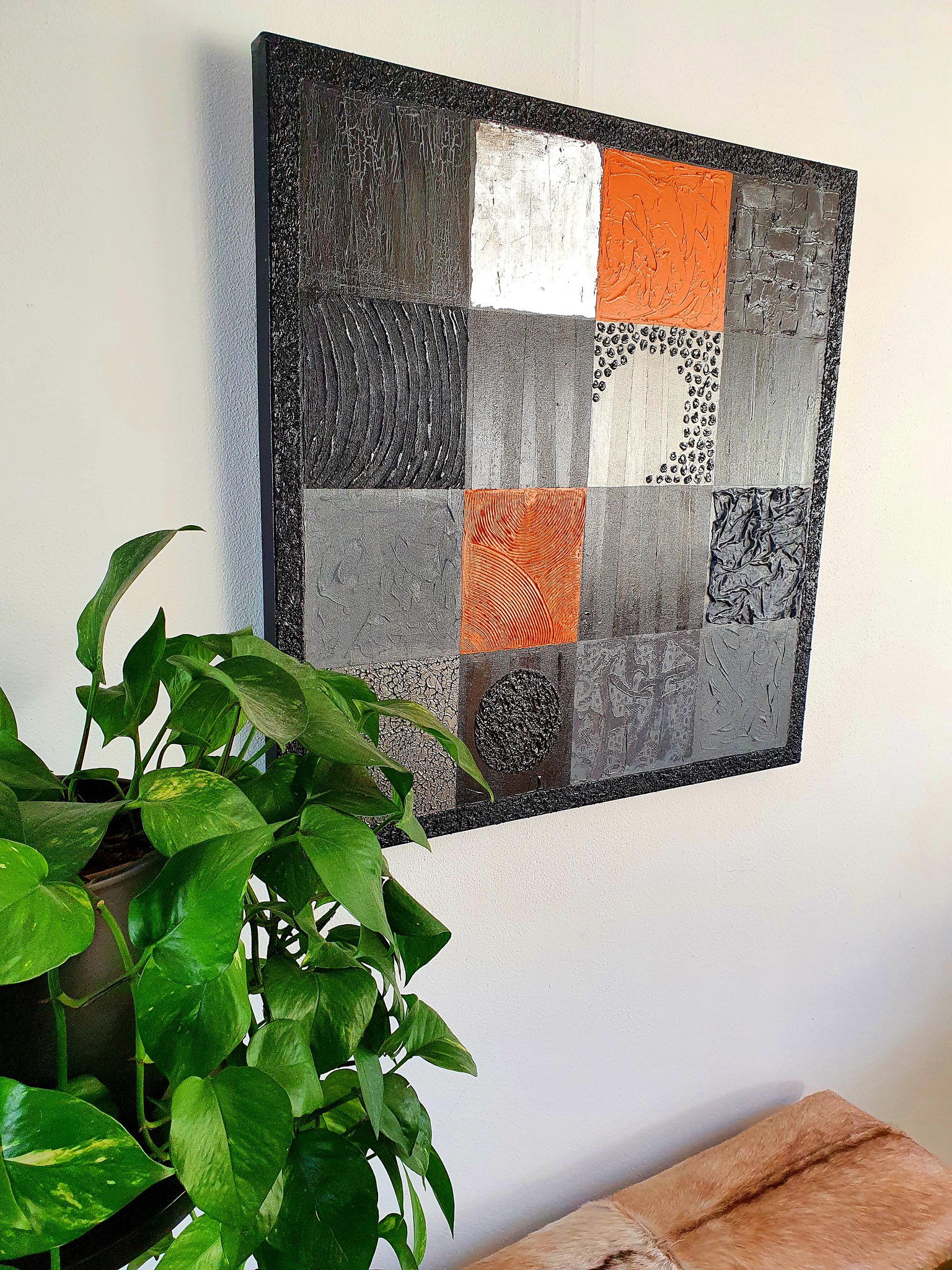 Orange. Schilderij op canvas va 80x80x4 cm. Verdeeld in 16 vlakken met elk hun eigen structuur en kleur. De kleuren zijn zwart, grijs, bruin, zilver en oranje. Afgewerkt met een hoogglans vernislaag. Rechtstreeks van de kunstenaar, de koper is de eerste eigenaar. Handgesigneerd. Als het schilderij verstuurd moet worden, dan wordt het goed verpakt in bubbeltjesplastic, piepschuim platen en een kartonnen doos.