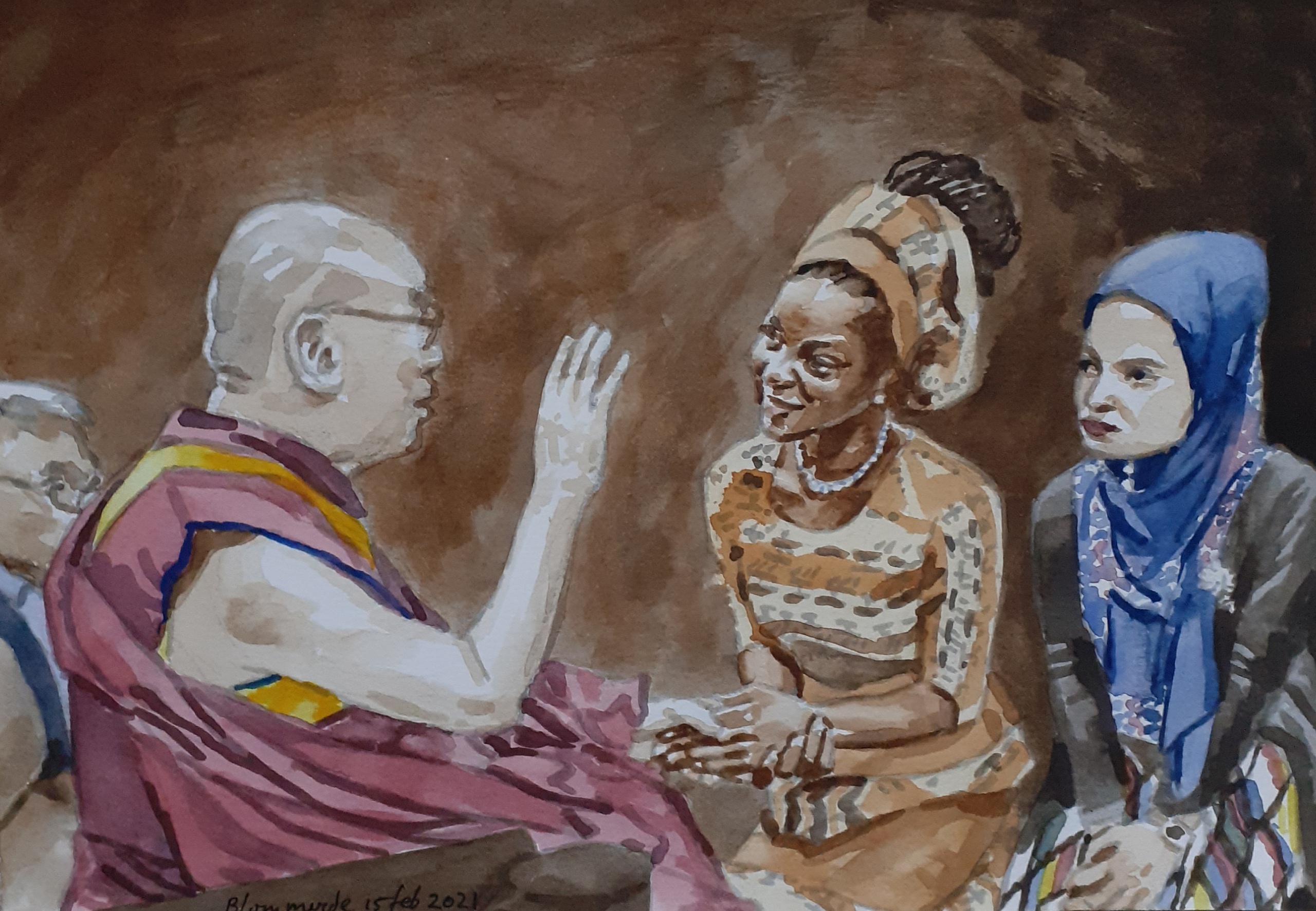 Aquarel van de Dalai Lama in gesprek met vertegenwoordigers van verschillende culturen