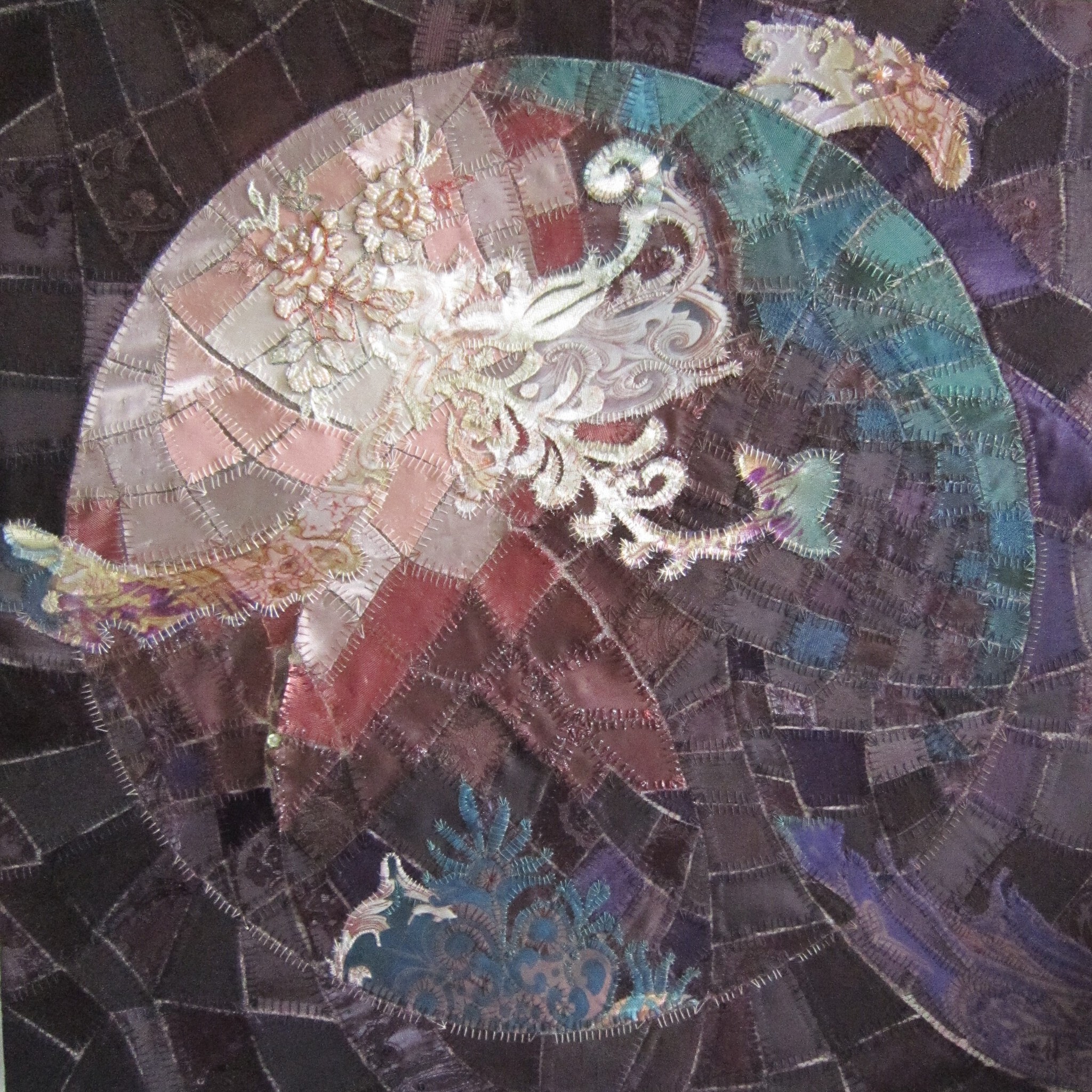 droom-land, 'schilderij van textiel', het werk bestaat uit verschillende kleine stukjes textiel met daarop een applicatie van zijde en oud kant, de inspiratie voor de kleuren komt uit de zijden applicatie