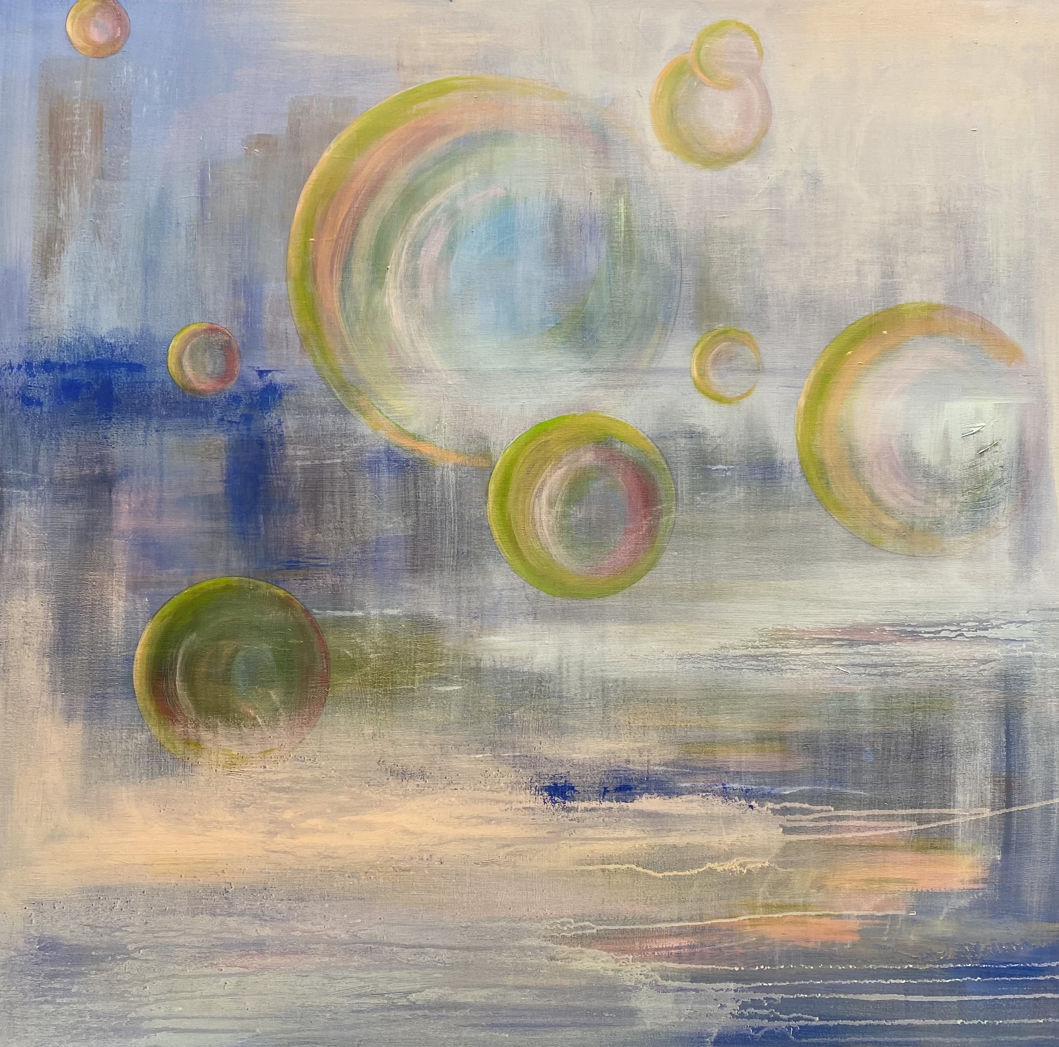we leven in een bubbel, ieder met zijn eigen identiteit er komt een tijd dat we eruit gaan en weer vrij zijn. We moeten nog even geduld hebben. Ik werd geïnspireerd door de wereld waar we in leven. Ik heb gebruik gemaakt van acryl verf een medium wat snel droogt. Maat: H 100 cm X Br 100 cm X D 4 cm. Gewicht 3,4 kg. Klaar om opgehangen te worden en gesigneerd.