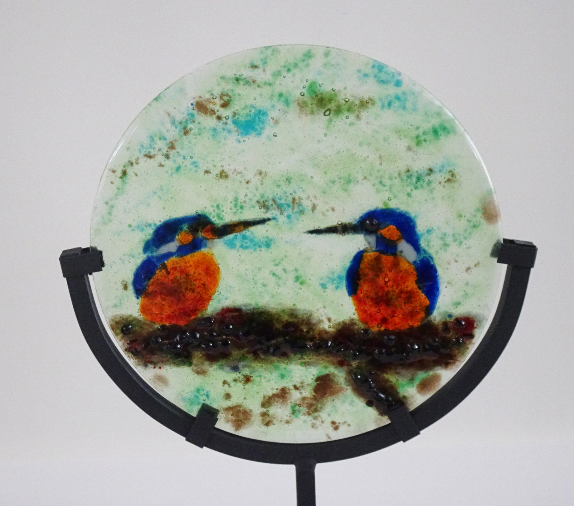 Twee ijsvogels in gefused met poeders in een cirkel van floatglas, op een zwarte metalen voet.