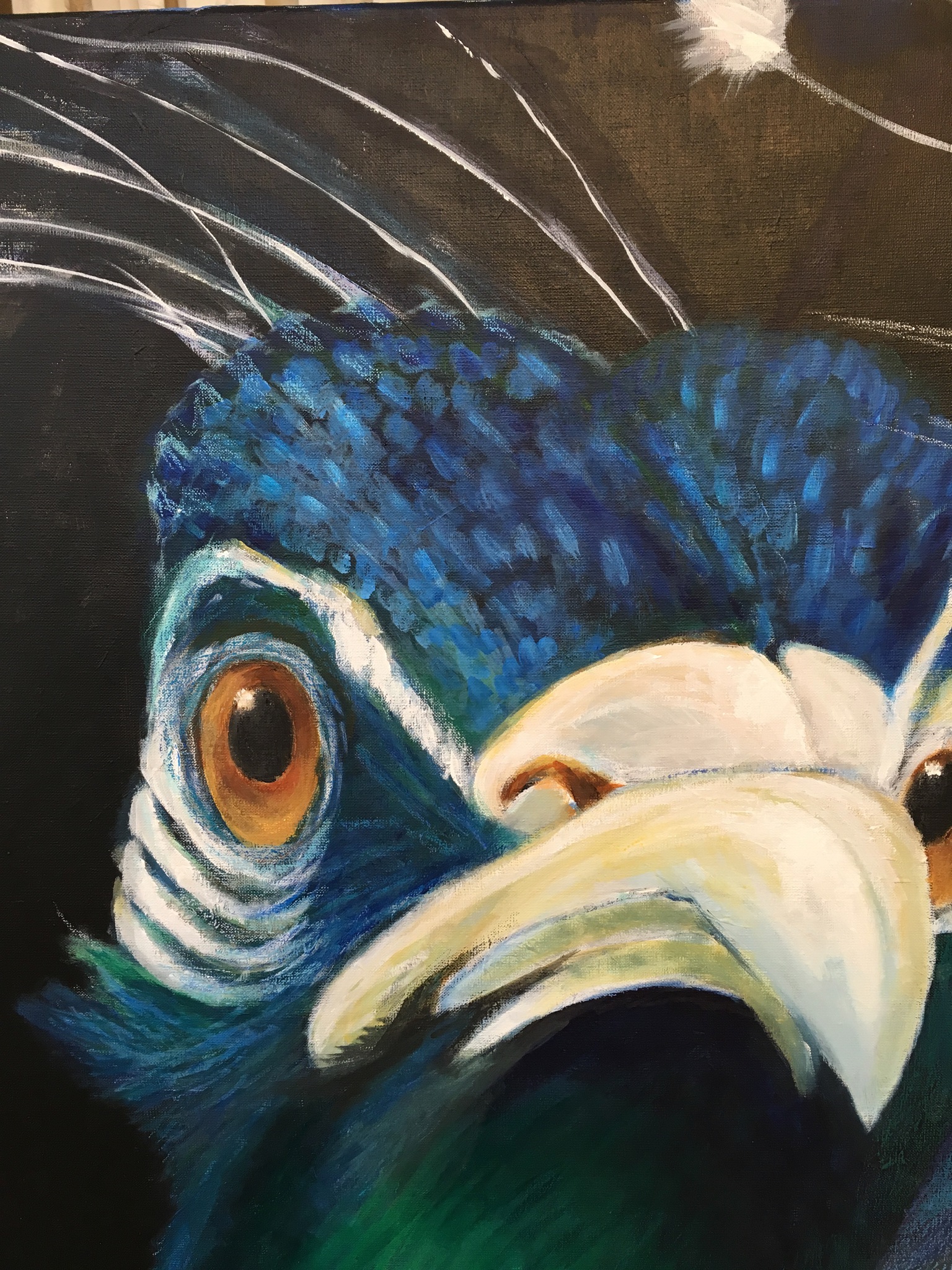 Een detail van het schilderij "De twee pauwen", de blauwe pauw en de witte pauw. Acryl en krijt op linnen.