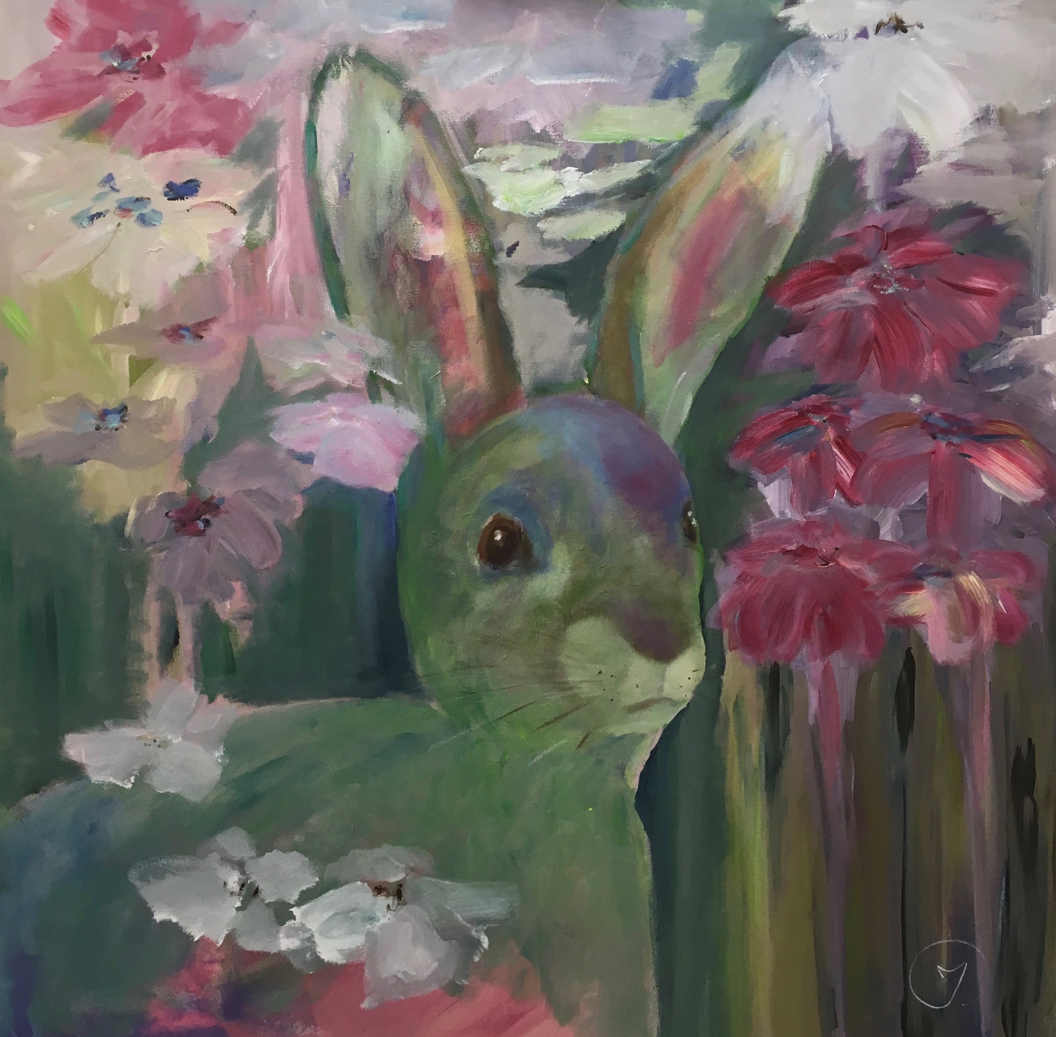 Een schilderij met lichte kleuren en de haas, een luchtige verbeelding van het voorjaar. Deels realistisch maar ook impressionistisch geschilderd met gebruik van acrylverf en krijt.