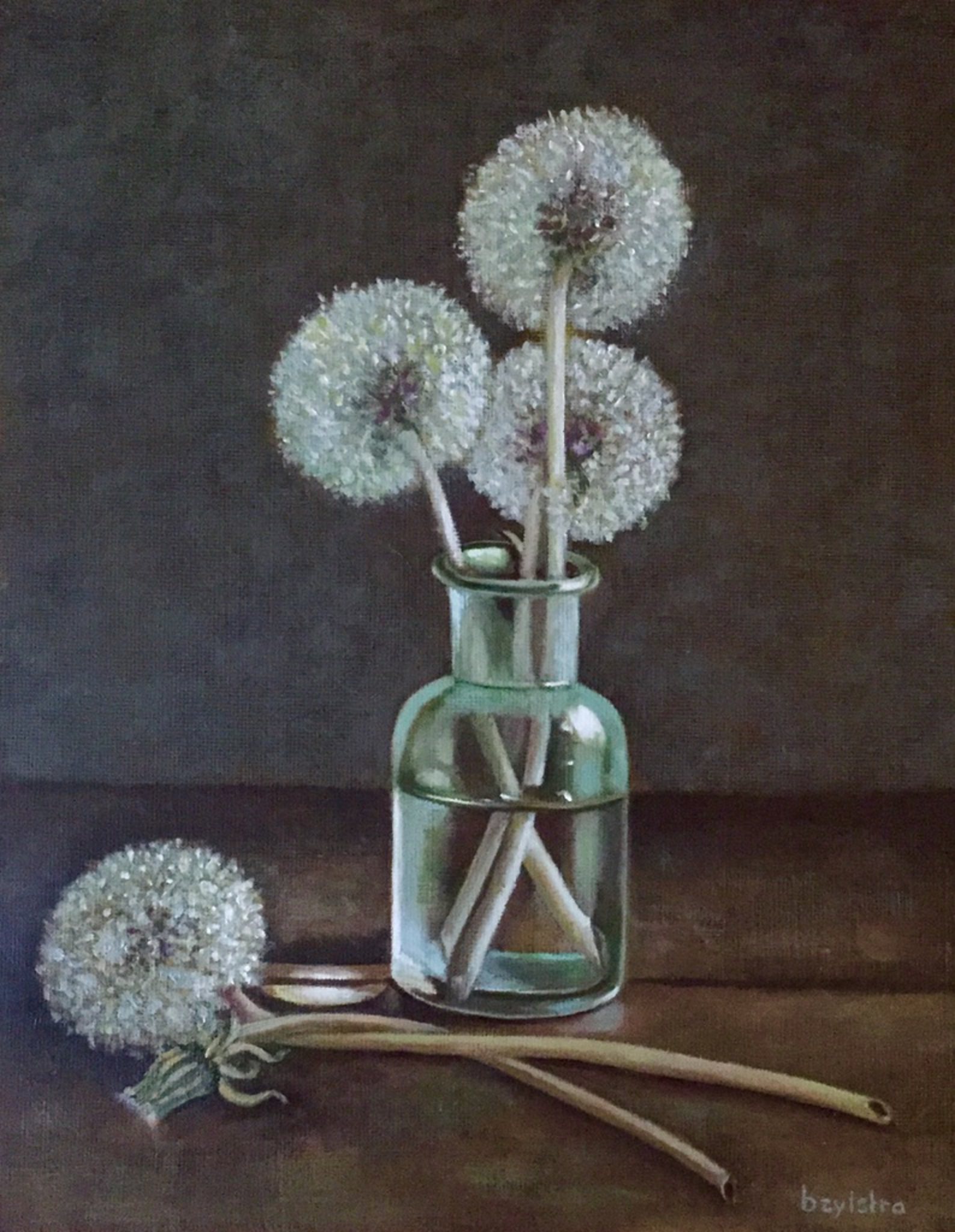 Vaasje met uitgebloeide paardenbloemen (naar een schilderij van H. Helmantel)