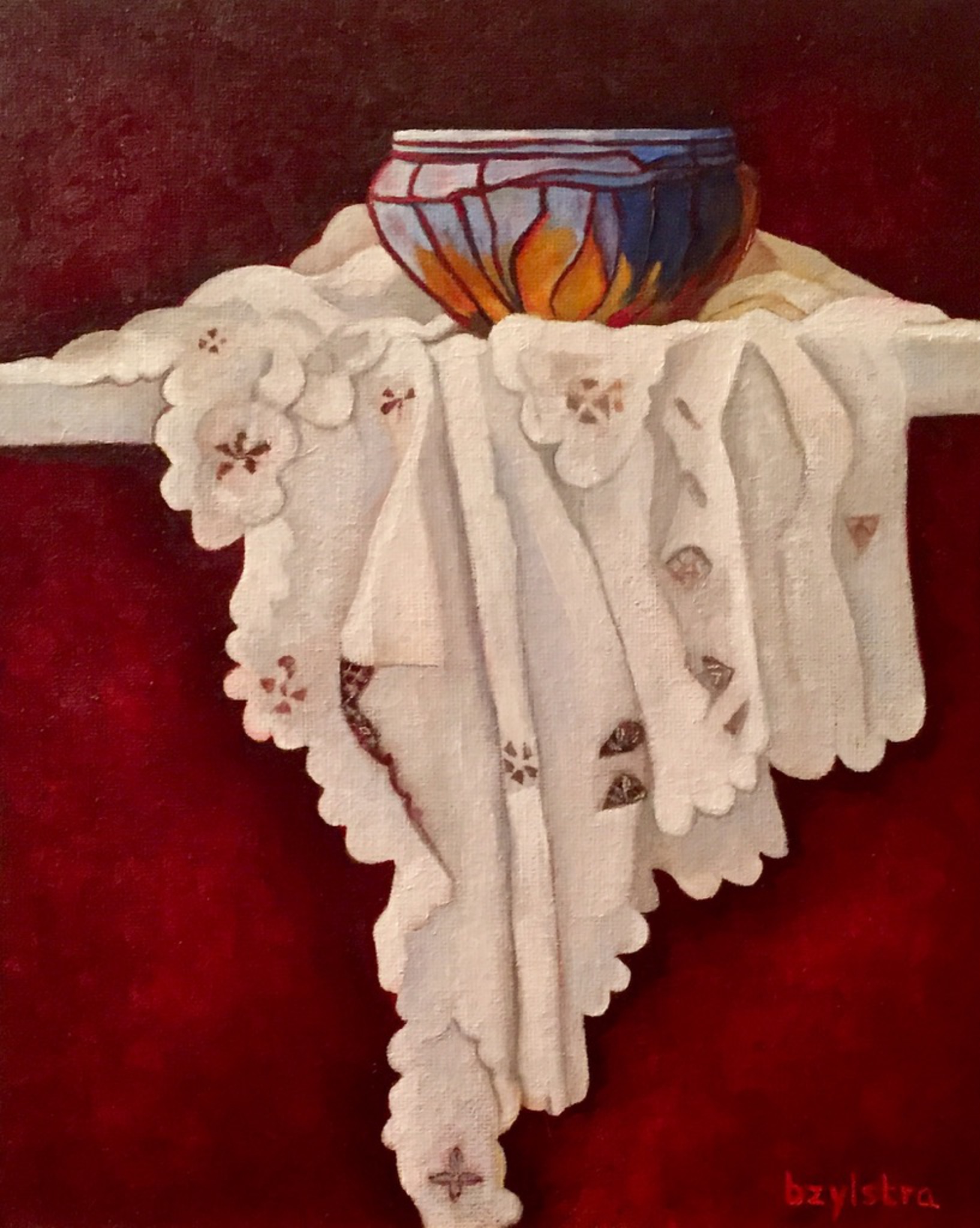 Stilleven met (geleend) kommetje op sierkleed