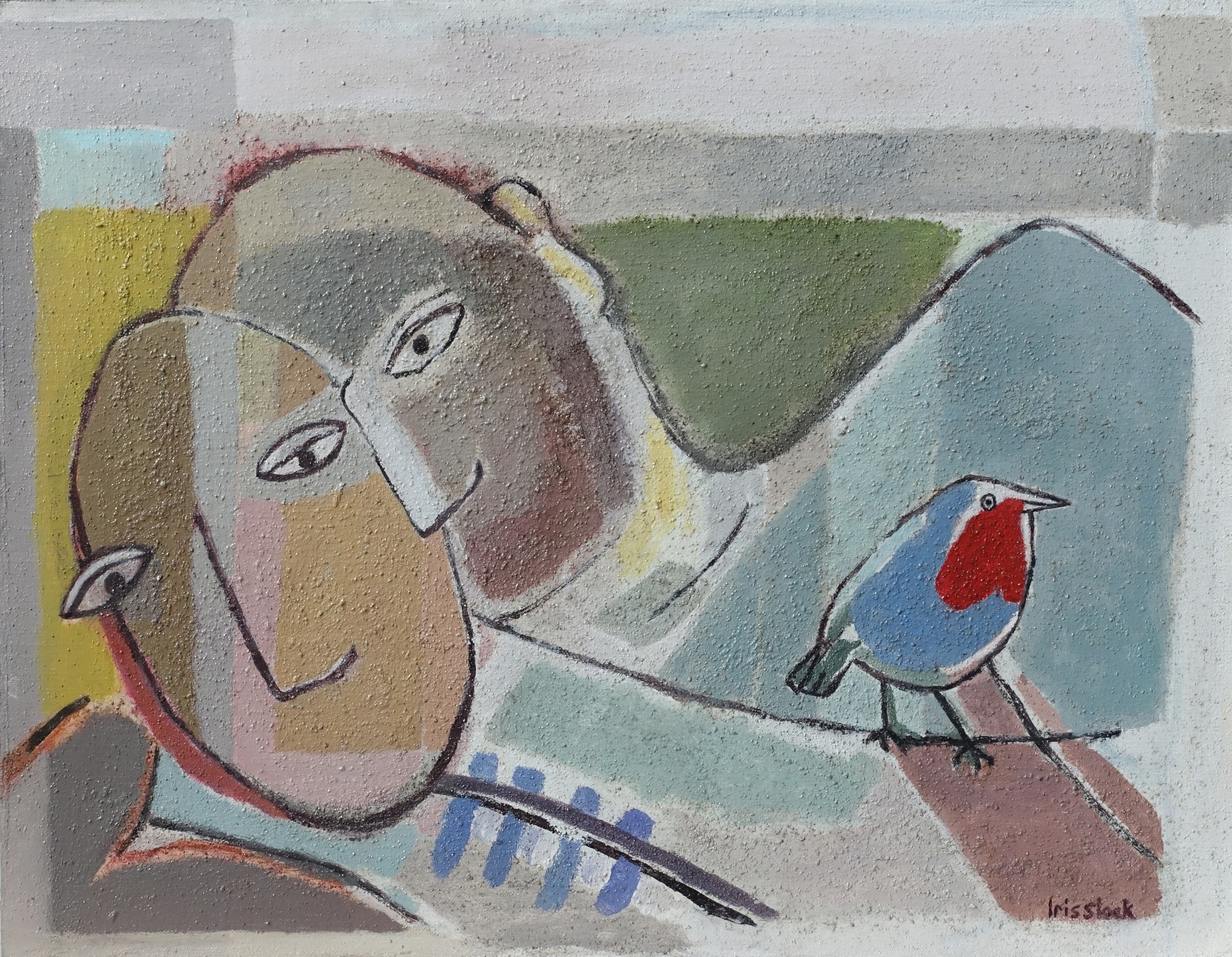 Twee mensen met een roodborstje. Het roodborstje staat symbool voor de liefde. Ingelijst 55 x 67 cm