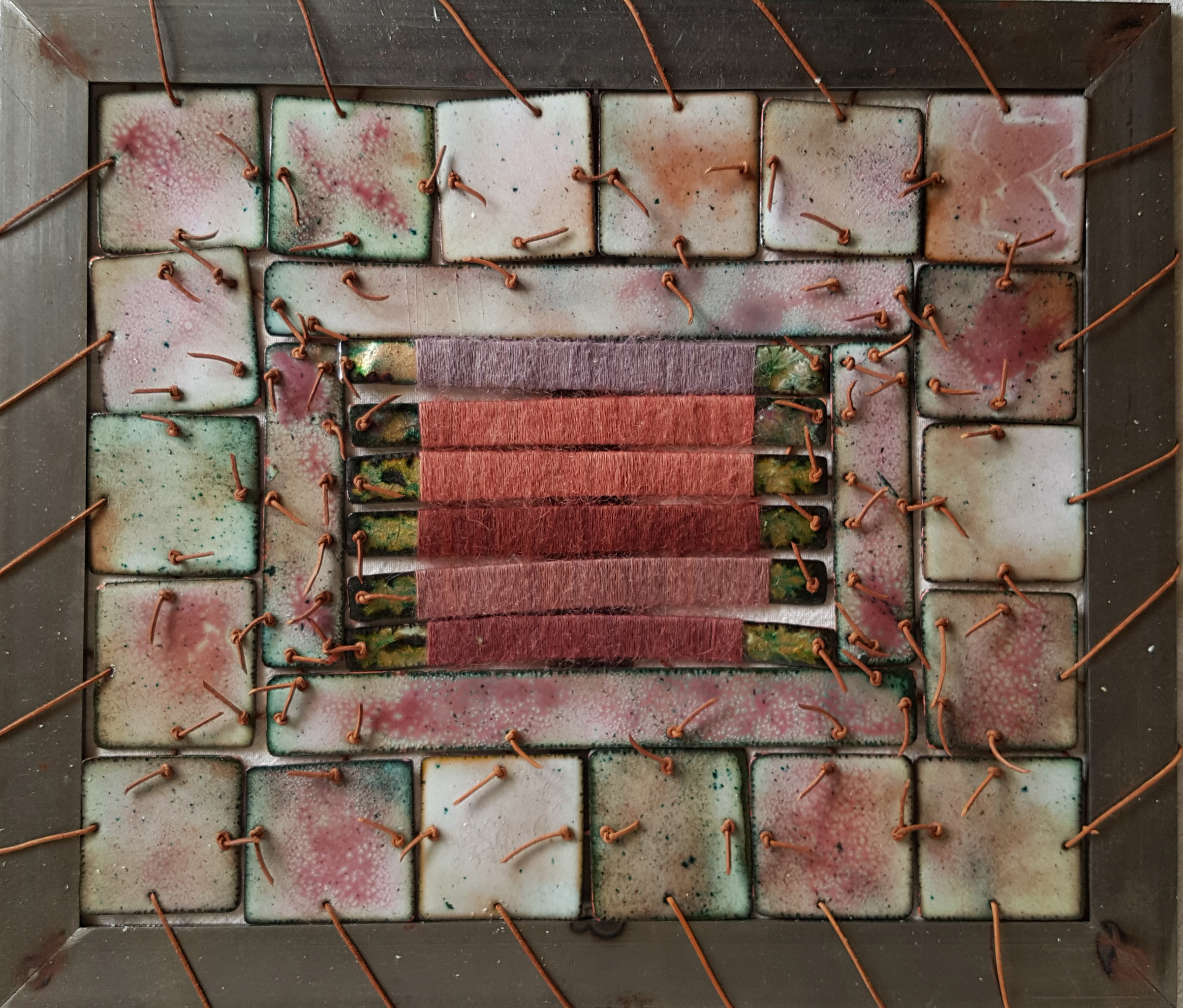 geemailleerde plaatjes koper, textiel leren veter