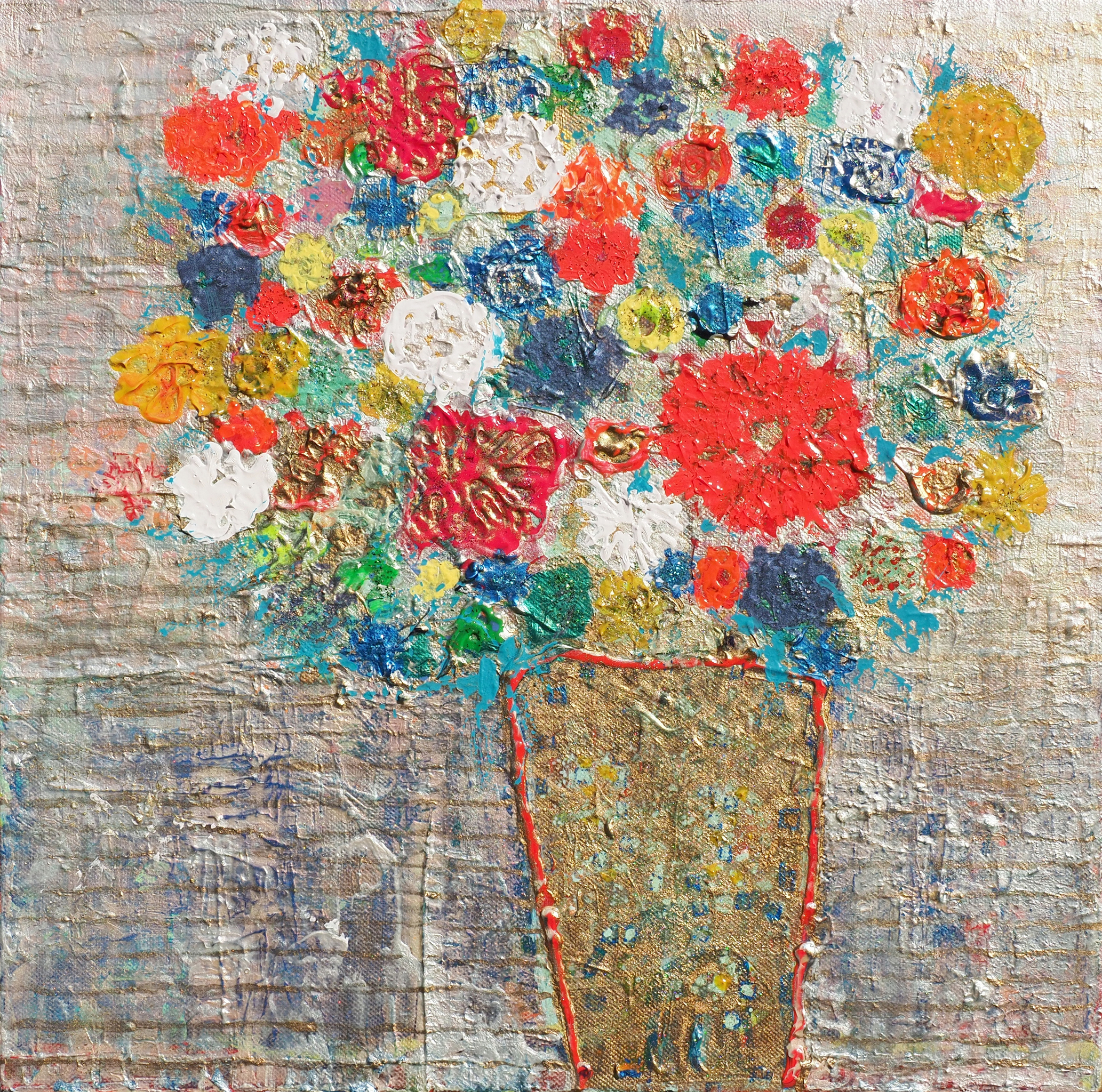 kleurrijke bos bloemen in vaas. gebruik van o.a. parelmoerkleuren, goudpoeder en acrylverf