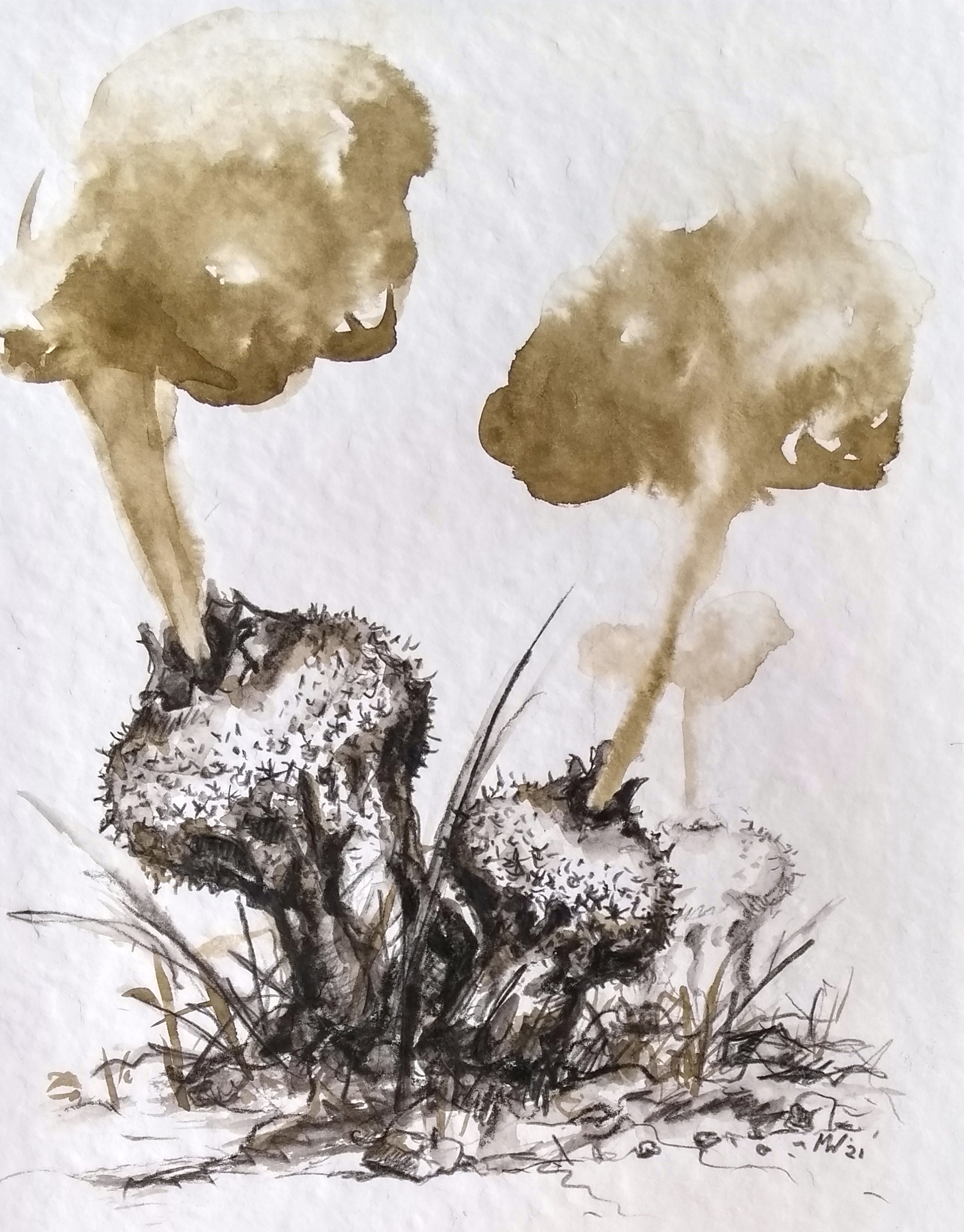 Sporen verspreidende plooivoetstuifzwammen met aquarelverf, -potloden en water op 300 grams aquarelpapier.