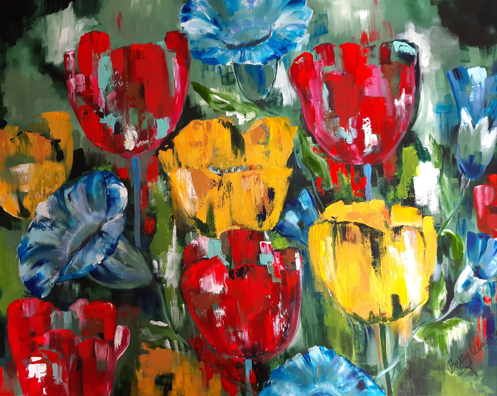 A hint of gold. Groot losjes geschilderd acrylschilderij met tulpen en winde. in de gele tulpen zijn toetsen met goud verwerkt voor een extra diep glans.