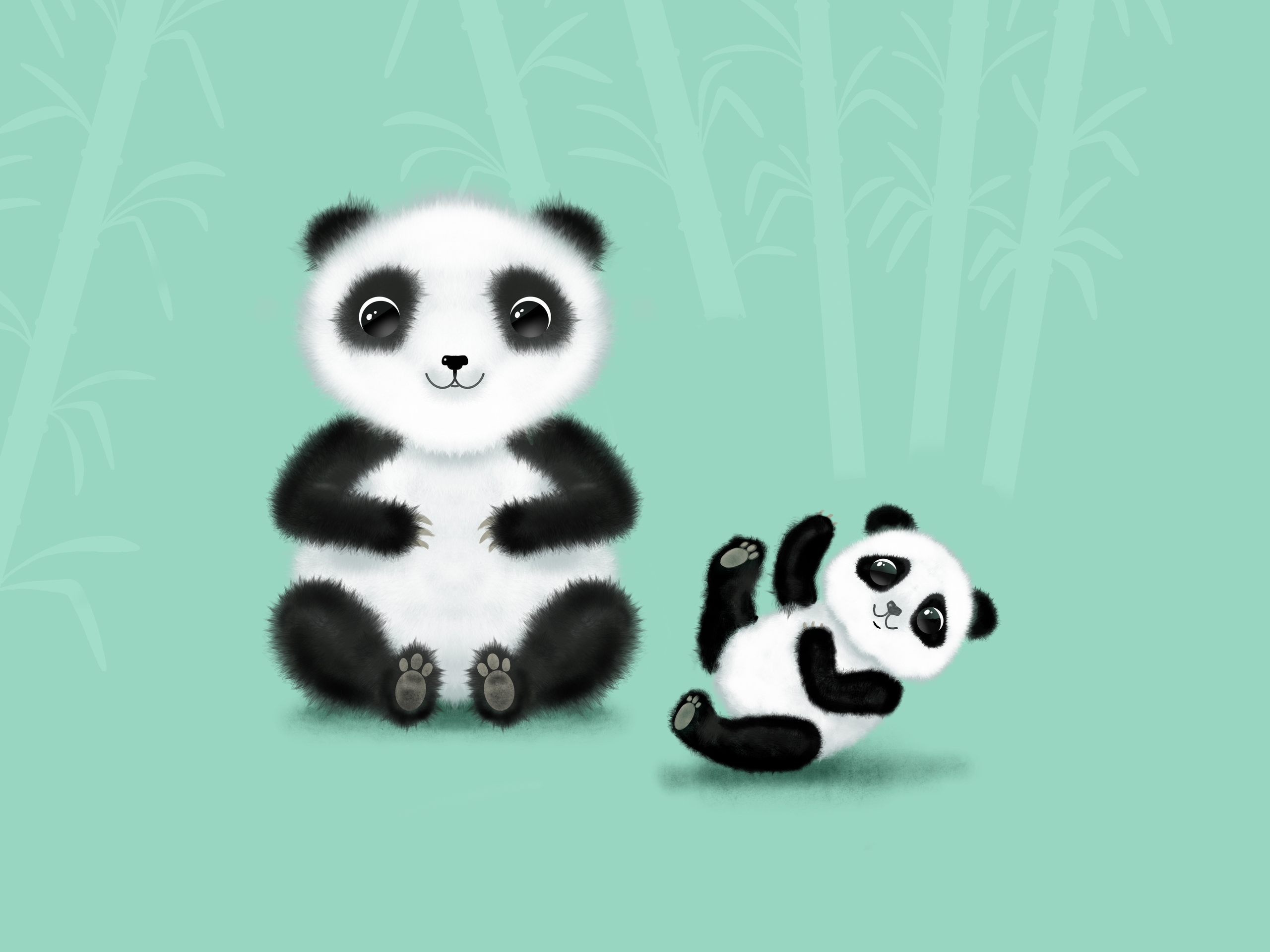 Twee panda's op mintgroene achtergrond. Als print verkrijgbaar en elk formaat via https://www.werkaandemuur.nl/nl/shopwerk/mama-en-kind-panda/767673/132