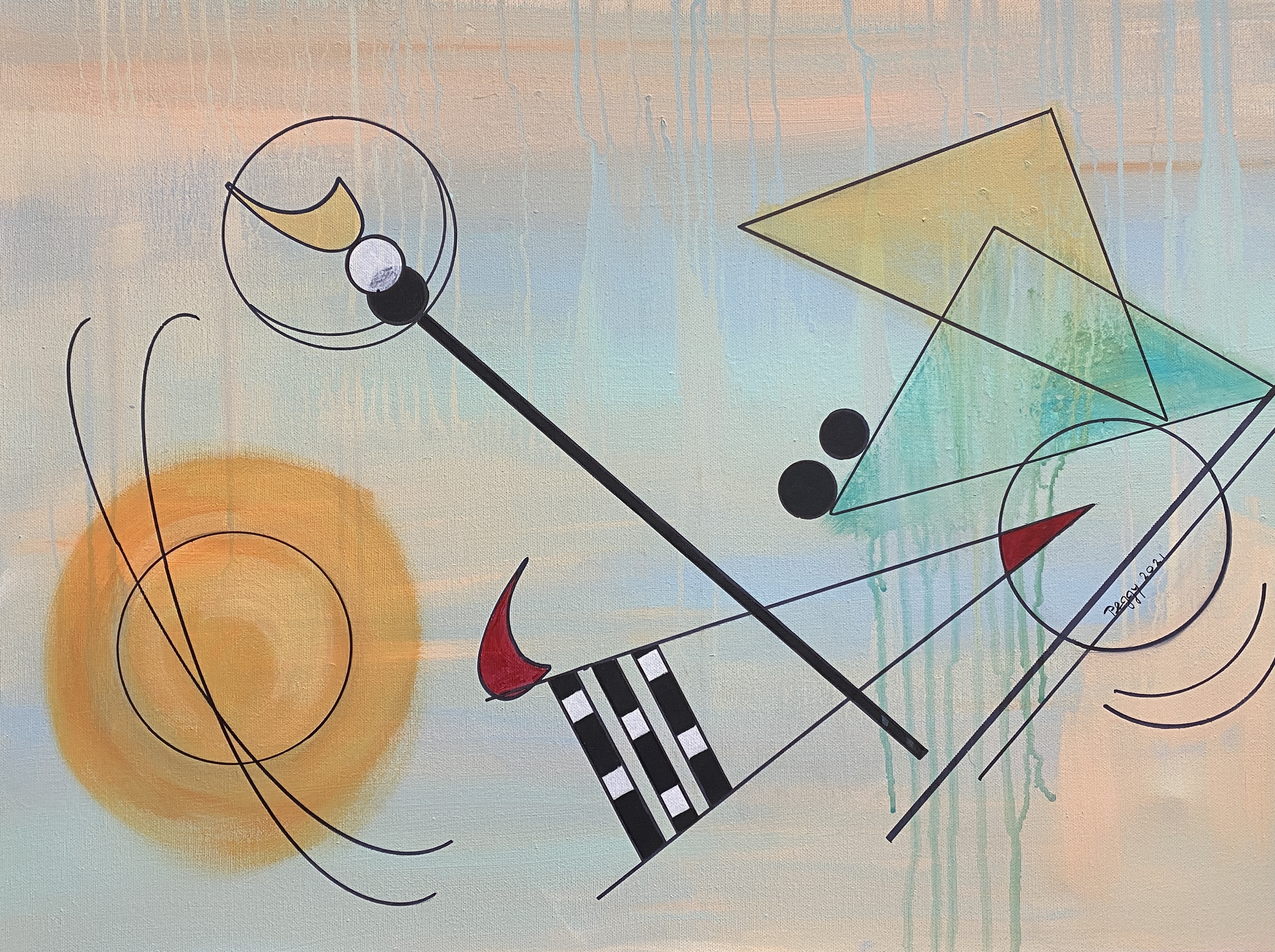 Ik ben geïnspireerd door Kandinsky. Ik gebruik acryl op canvas. De afmeting van het schilderij is H 50 x B 70 cm. Klaar om op te hangen Gesigneerd voor het schilderij