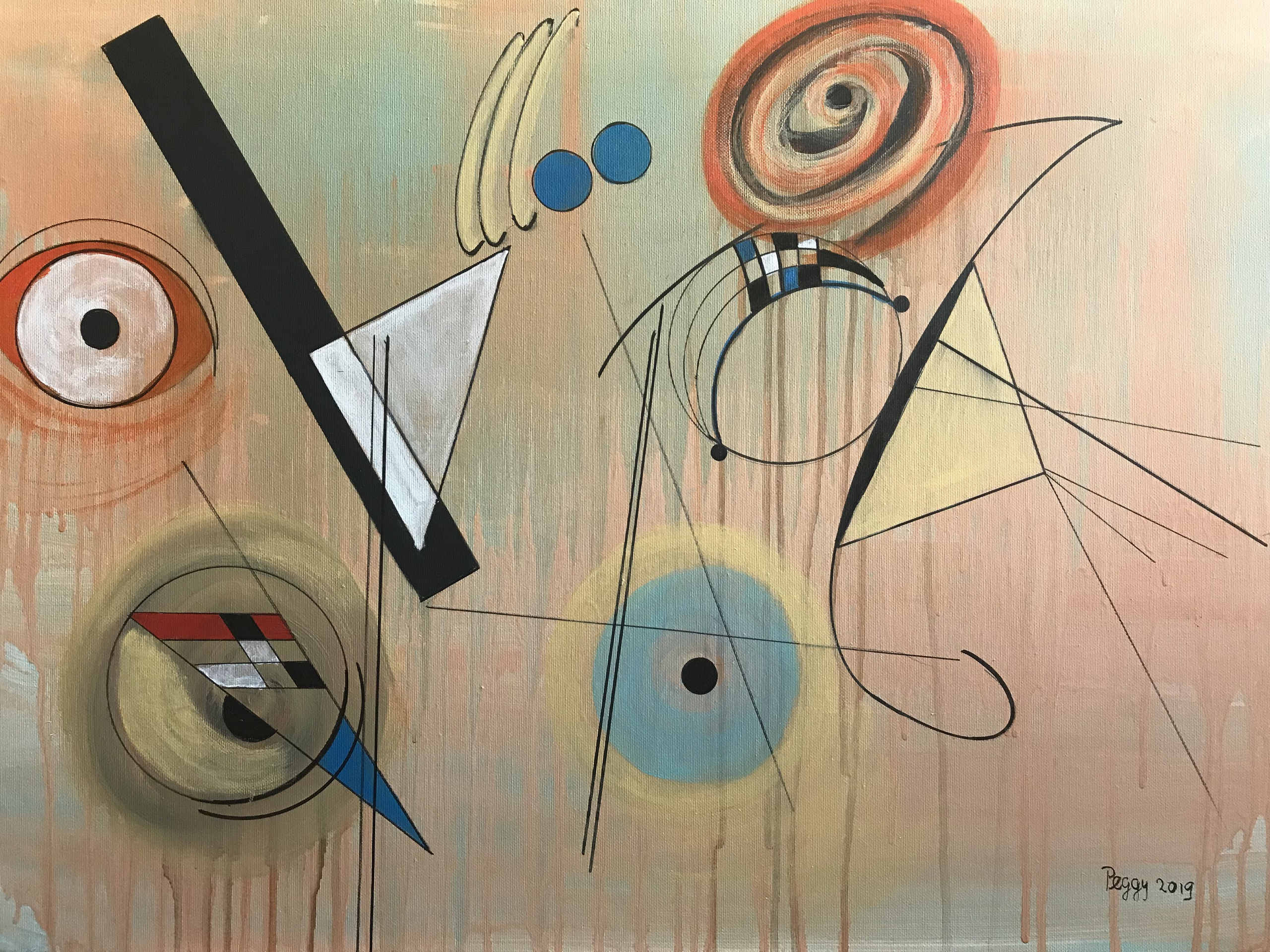 Ik ben geïnspireerd door Kandinsky. Ik gebruik acryl op canvas. De afmeting van het schilderij is H 50 x B 70 cm. Klaar om op te hangen Gesigneerd.