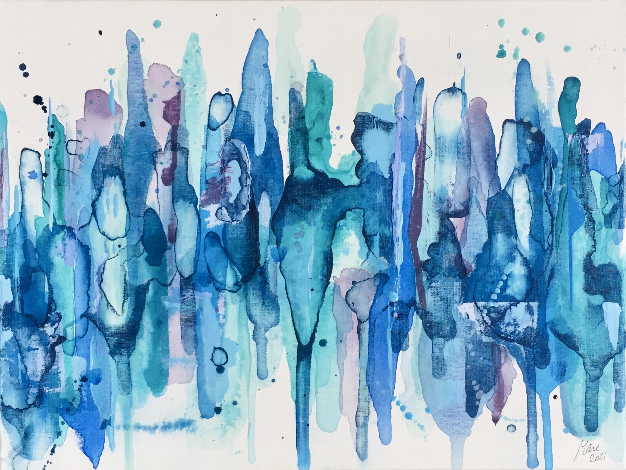 Een verandering in kleur. Blauwtinten zijn opwekkend en geven energie, daar had ik zin in. De eerste van een serie van drie, deze gecombineerd met lila, de volgende twee met geel. VERKOCHT