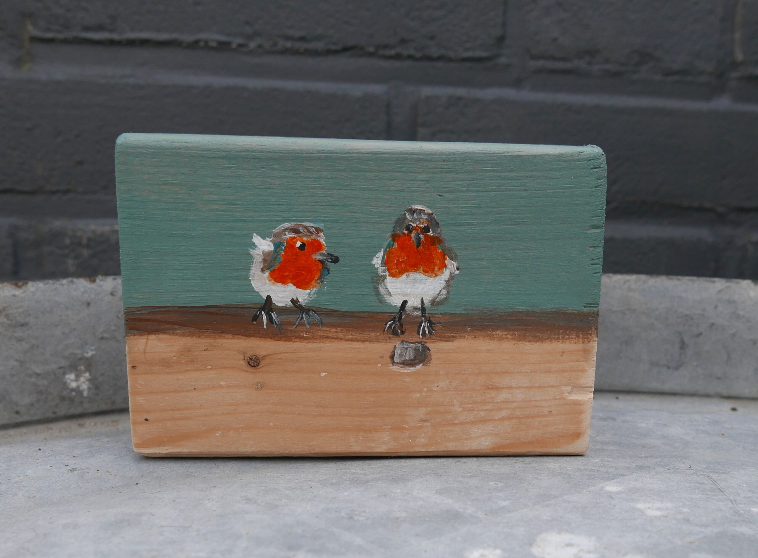 Stuk afvalhout beschilderd met roodborstjes, Voor- en achterkant zijn beschilderd. Ene kant twee vogels, andere kant 1 vogel.