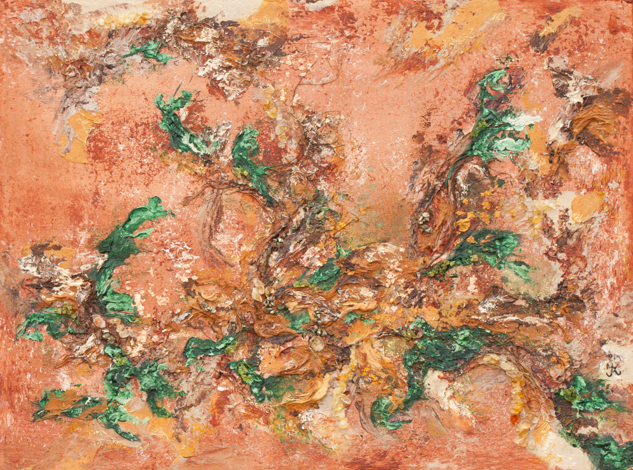 Acryl op doek, gemengde techniek met citrien, peridoot, pyriet en beschilderde houten lijst.