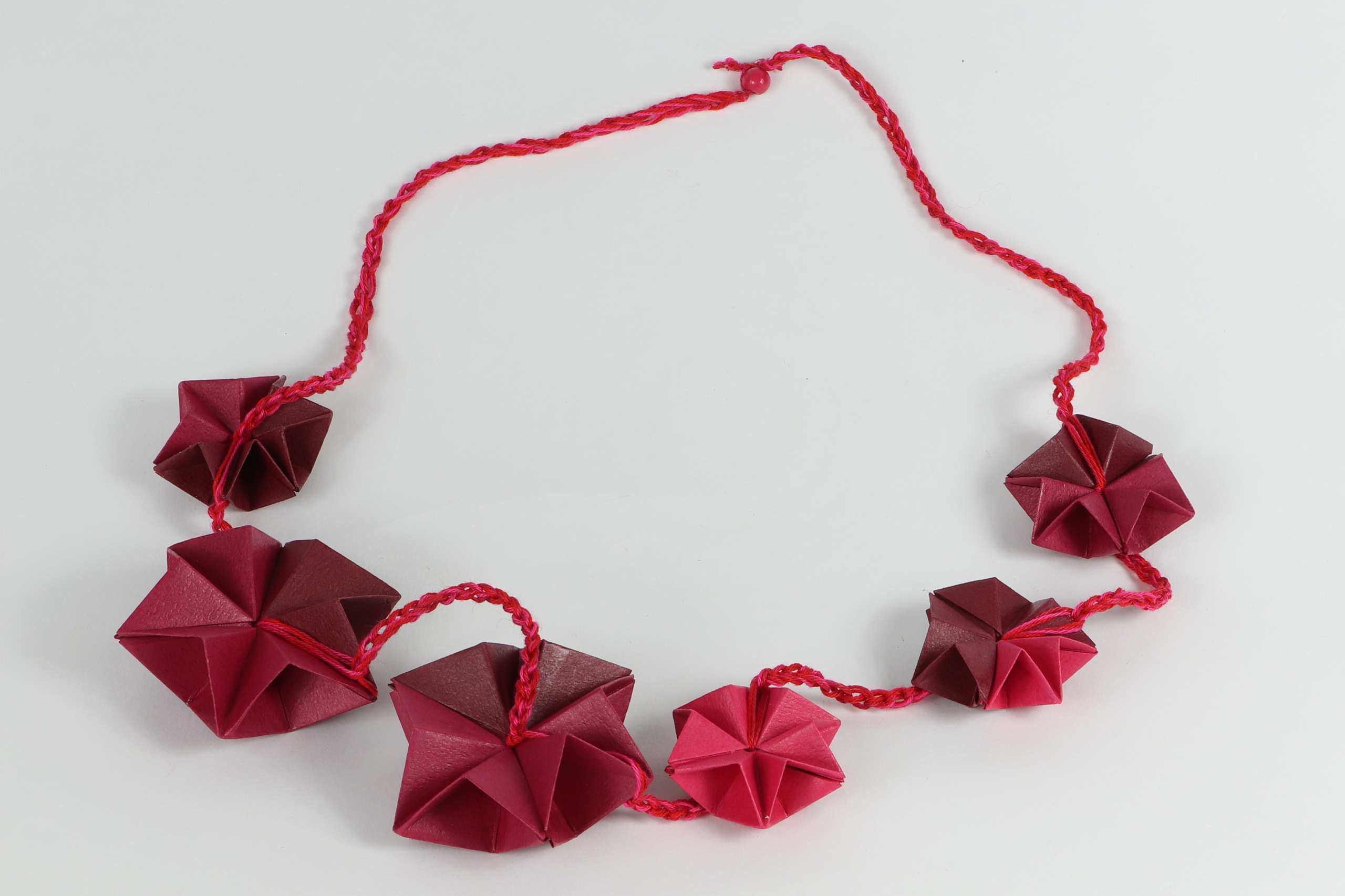 origami gevouwen sterren in diverse tinten rood, verbonden met gehaakt shashiko garen, afgewerkt met acryllak