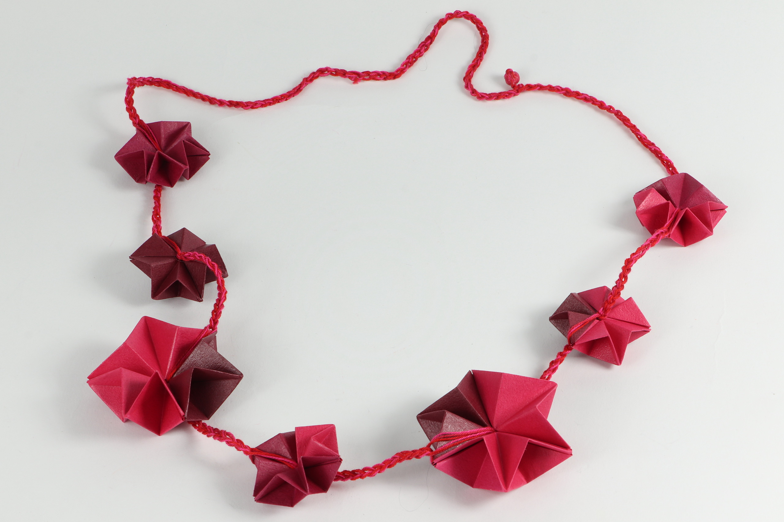 origami gevouwen sterren in diverse tinten rood, verbonden met gehaakt shashiko garen, afgewerkt met acryllak
