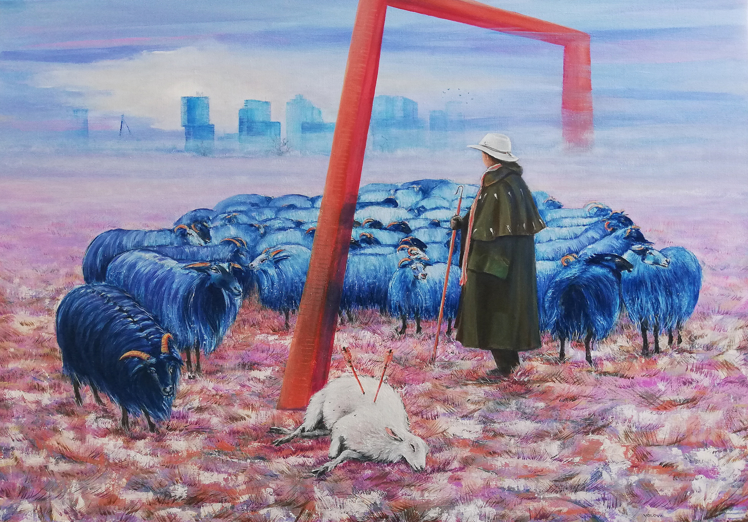 metafoor-tafereel De voorstelling gaat over wat normaal was (witte schaap) nu dood is. En wat niet normaal was (blauwe schapen) leeft en wordt bewaakt...