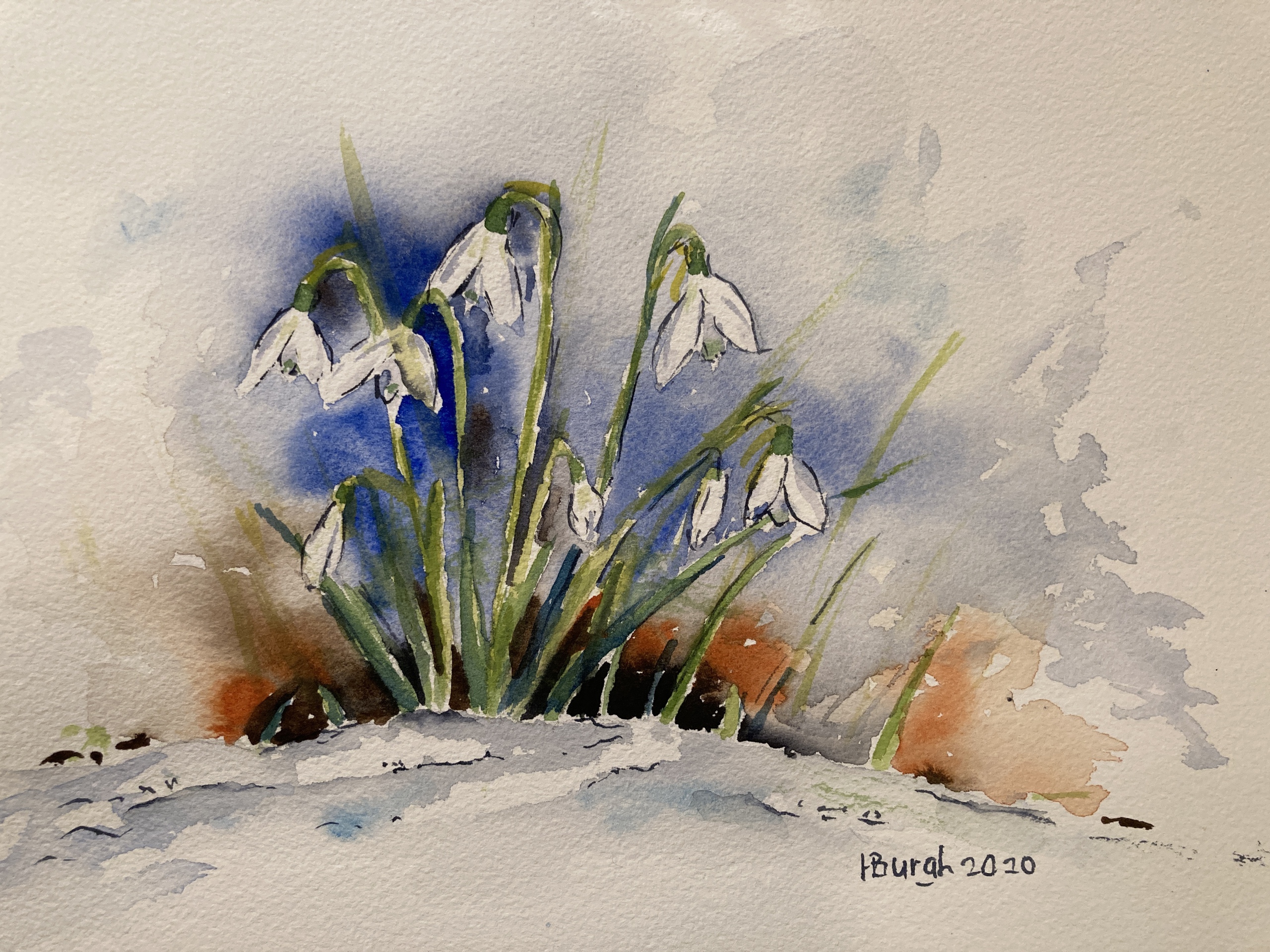 Sneeuwklokjes zijn de voorbode van de lente. De sneeuwklokjes zijn in grote getalen te zien in het bos hier heel dicht bij (Amelisweerd, Utrecht). Ze motiveren me elk jaar weer om te gaan schilderen. De steeltjes en klokjes heb ik uitgespaard met maskeervloeistof.