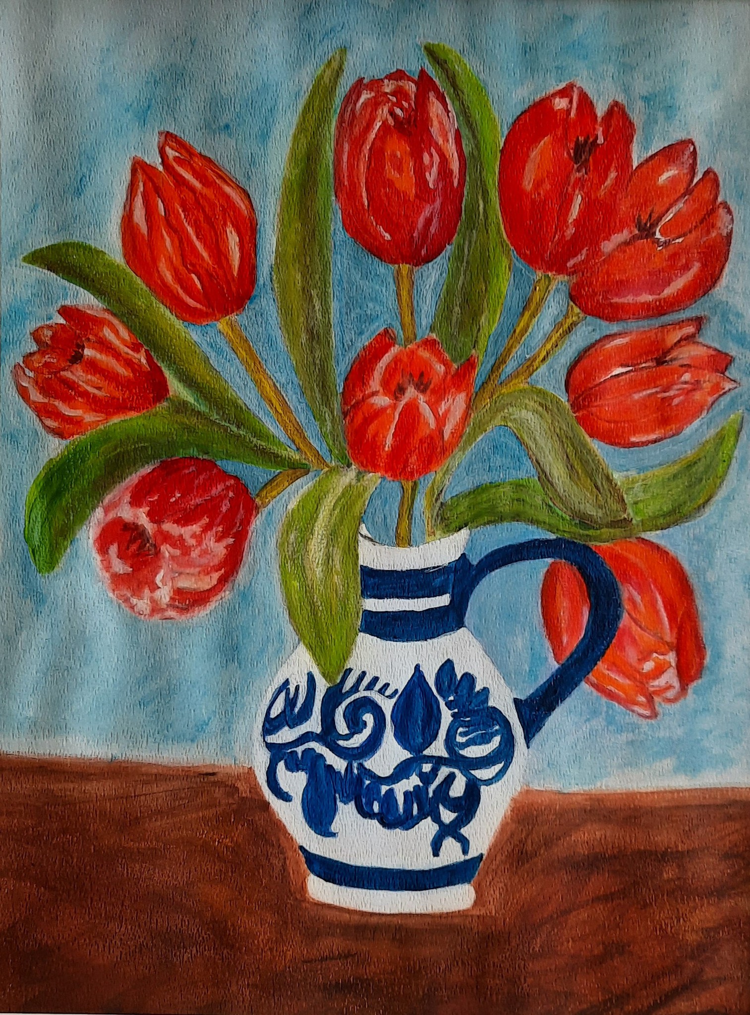 Tulpen in Hollandse vaas geschilderd, ingelijst met bijpassende passe-partout. Expostie Sint Jozefoord van Kunstkring de Meent te Nuland, thema bloemen 22 maart t/m 21 juni 2021
