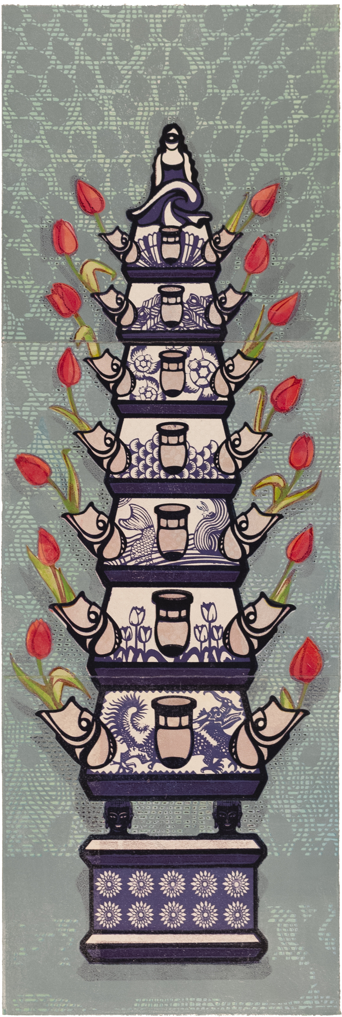 Deze hoogdrukprent van een oosters georiënteerde tulpenvaas is gedrukt een oplage van 12 unieke kleurvariaties. Dit is nummer 2 uit de serie.
